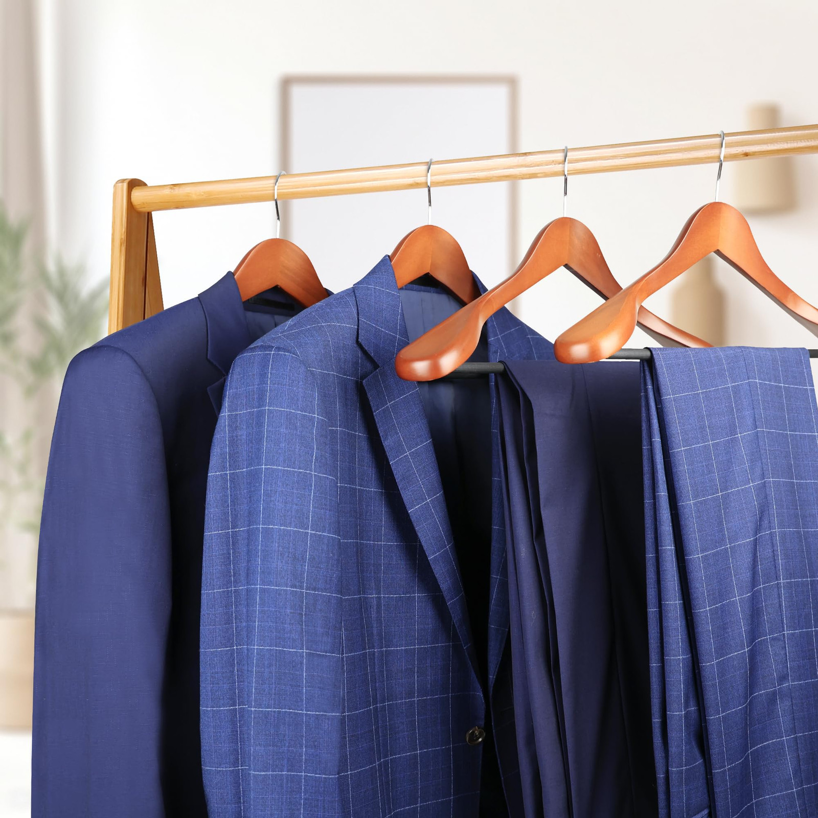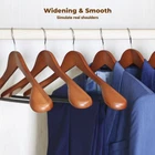 These wooden hangers are a game-changer for my closet—solid, durable, and beautifully finished with a sleek matte look. The wide shoulders keep my coats and shirts perfectly shaped, while the non-slip bar ensures pants stay wrinkle-free. The 360° swivel hooks make organizing effortless, and they handle heavy garments without bending. Love the quality!