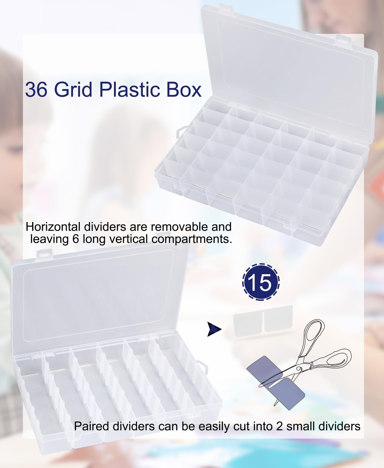 8 Pack 36 Grids 8 Pack 36 Grid Plastic Box: 15 Paired plastic removable dividers make box organizer 36 individual compartments, organizer boxes are commonly used for organizing small items such as beads, jewelry, buttons, screws, nails, and other small crafting or hardware supplies. Clear Plastic Organizer: Clear enough to easily see the contents inside and convenient to locate specific items without opening the box. 3600 Tackle Box: 10.9x7x1.7in compact in size, easy to store on desk, drawers and backpack when going outside. Can be your bead organizer, tackle box organizer, plastic jewelry organizer, craft storage, screw organizer, small parts organizer, sticker organizer, earring box. Plastic Organizer Box with Dividers: Paired dividers can be easily cut into 2 small dividers, can customize the size of each compartment according to your storage needs. Horizontal dividers are removable and leaving 6 long vertical compartments. Sturdy Plastic Box: Made from sturdy plastic materials, lightweight but sturdy. Secure snap closure close the lid and prevent the compartments from accidentally opening during transport or storage.