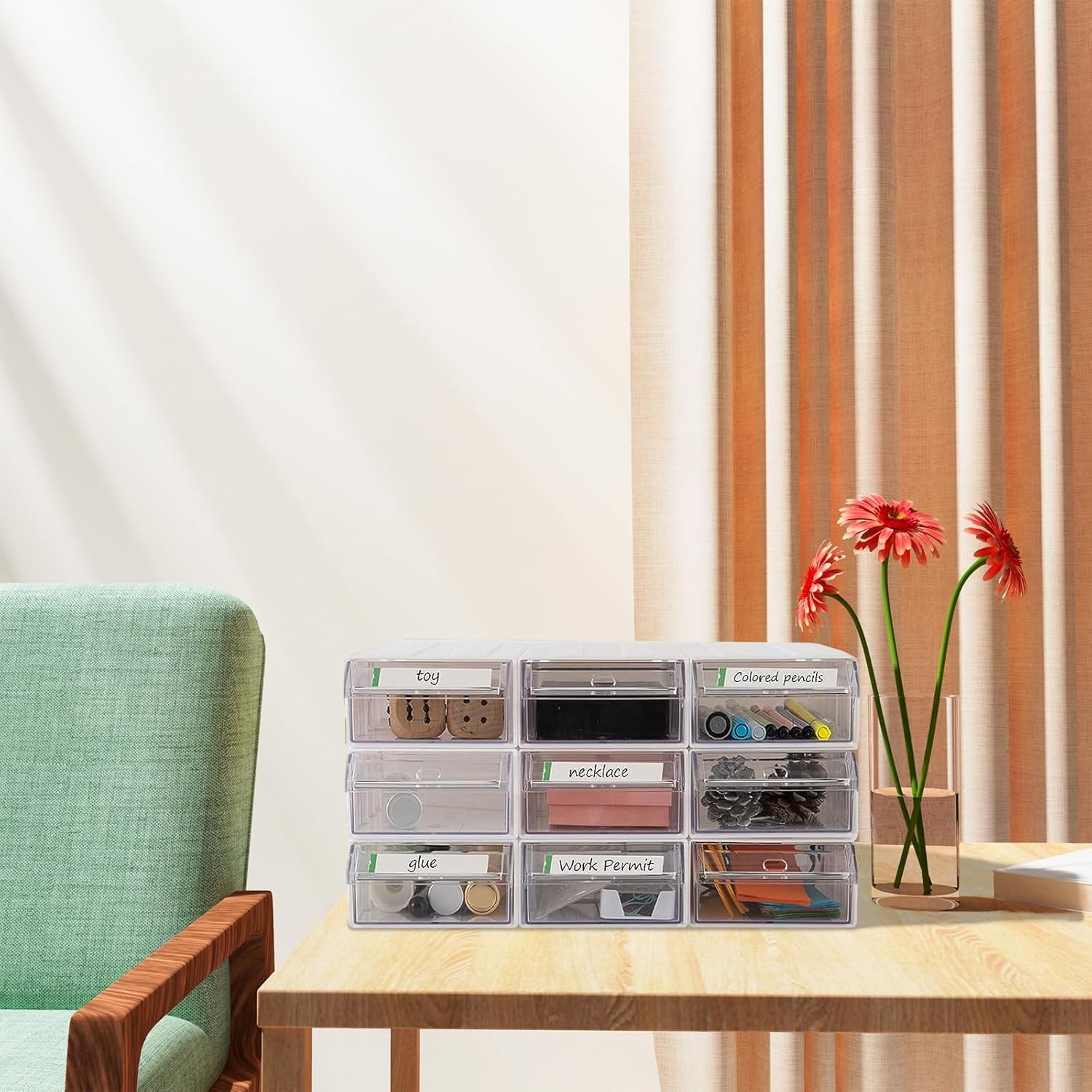 Package Include:You will get 9 pcs plastic stacking drawer cabinet for small itemswith 18pcs Clear Dividers Multifunctional organizer rack and 9pcs Tag Card.Quantity is enough to meet your daily needs. Proper Size:Each drawer stacking storage cabinets measures 7.87 x 4.29 x 2.12 inches and can hold many small items such as jewelry, gadgets, cosmetics, etc. These storage boxes can be stacked on top of each other and can be easily disassembled and assembled. Durable Material:These 9 drawer separable storage organizer is made of high quality plastic, strong and durable, high toughness, wear-resistant, good anti-pressure, not easy to be crushed. Can serve you for a long time. Practical Design: These desktop storage container come with the help of 9 pieces tag cards, it will be easy to mark and classify the items in each drawer.It is convenient for you to quickly find what you need from these plastic storage boxes.These transparent separators can divide the drawer into the space you want. Wide Application: These plastic stacking storage-in-drawer cabinet adopts can be used to store stationery and office supplies, such as scrapbook stickers, cards, invoices, pens, clips, glue, etc.Our plastic drawer type organizer boxes can also be used to store a variety of cosmetics, jewelry, hair accessories, medicines, small blocks toys, sewing supplies, DIY crafts and kitchen supplies.If you encounter any problems, please contact us and we will do our best to meet your needs and answer your questions.