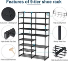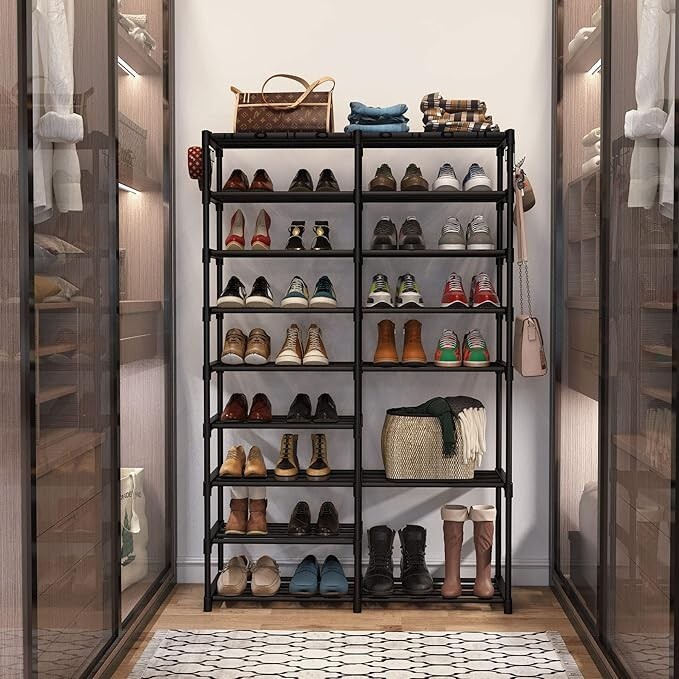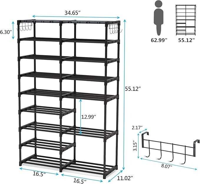 【LARGE CAPACITY】Large shoe shelf adopts 9 layers + 7 layers design as you see, Strong enough to hold 32-40 pairs of shoes, it fits almost all of your shoes 【STURDY & STEADY】Shoe organizer is made of double-row hole plastic connectors and Sturdy metal bars, light in weight but steady 【HOOK DESIGN】Hooks on both sides of free-standing shoe racks are convenient for putting your keys, purses, earrings, ties, belts, scarves, etc. 【LARGE SHOE RACK】Overal size is 34.65''x11.02''x55.12'', weight is 7 LBS, great size and can be adjusted to fit the height of just about anywhere, Easy to stack your shoes 【COVER DESIGN】The top PP cover of the tall shoe stand is waterproof and dustproof, and easy to clean 【Easy ASSEMBLE】The uniform specification of the plastic connector makes it easier to assemble, our boot rack comes with clear directions and a little tool(Gloves and wooden hammer)to assemble 【100% SATISFACTION】Fit your space, fit your budget, purchase with confidence, we will try our best to solve any problems that cause your dissatisfaction