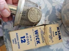 This Aladdin #12 is missing a smoke bell, and has a wrinkle in the font. It has had some surface rust removed. Just add a chimney and mantle, and it's ready to burn. It has a N.O.S. wick just installed, but needs to be charred, plus two NOS wicks included.