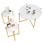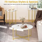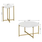 【Upgrade your Life】Comes with a marble finish round coffee table and two round end table that bring a more high class feeling to your house, this modern living room round table set is practical but also creates a strong modern atmosphere. 【Premium Quality】The coffee and end table sets was maded of MDF and metal legs, the soomth surface is waterproof, scratch resistant,and the metal base support ensure its sturdy. 【Sturdy and Safe】This round coffee tables with a X base structure, which ensures stability ,four adjustable metal feet pads also well prevent scratching your floor. With the smooth surface and round corners, you won’t be injured when bumping up. 【Multipurpose】Use this 3-piece table set individually or together both are the perfect choice.The coffee table was ideal for teatime,while the 2 small tables can be used as nightstand and sofa table, which is perfect for magazines or display green plants and bold decorations. 【Easy to Assemble】Smooth marble tabletop which is make it easy to clean and just will take you around 10mins to put together,instructions and accessories are all included in the package. Coffee table :31.4"Dia x18.1"H; 2 Side tables: 15.5"Dia x 23.6"H