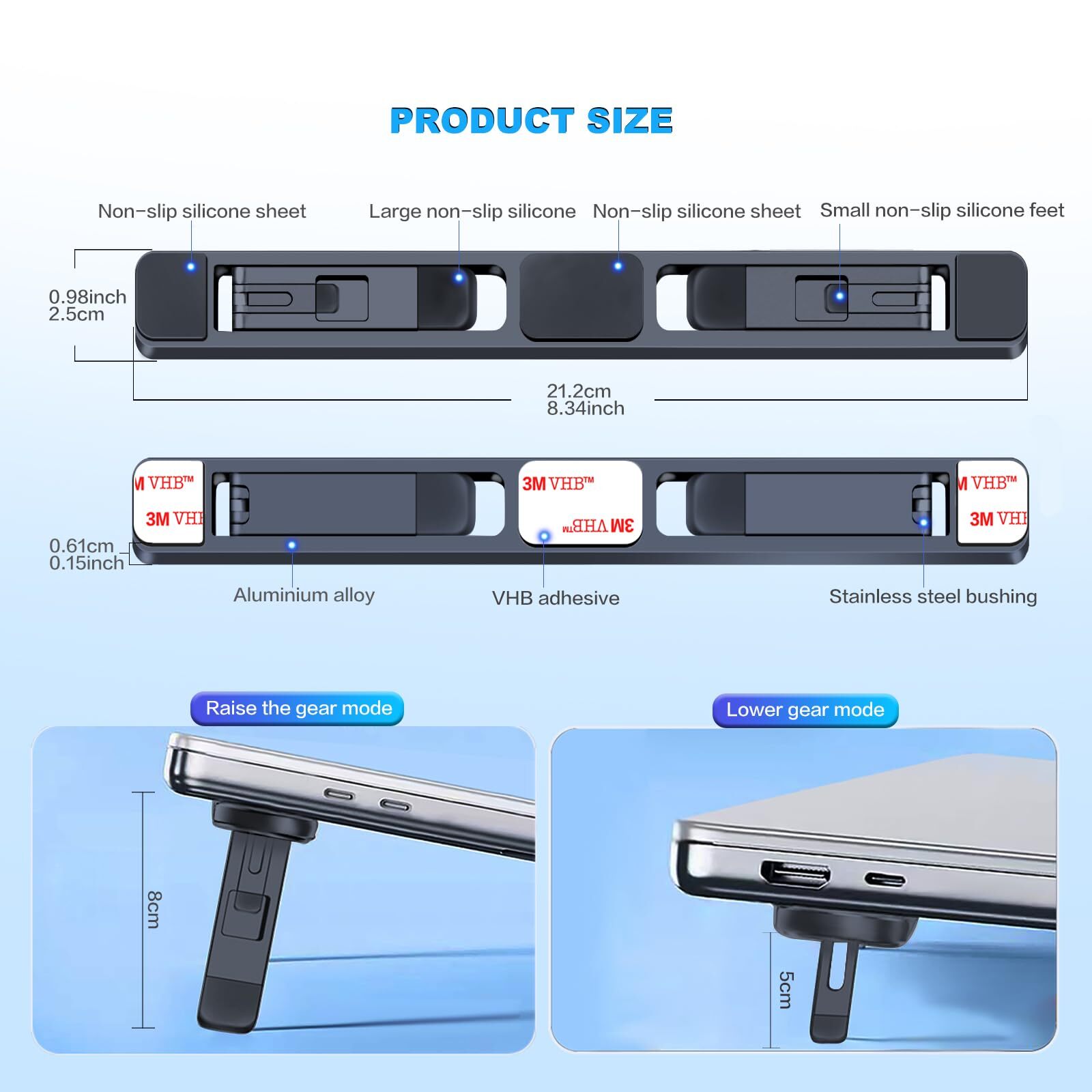 1.Widely compatible: Adjustable laptop stand, Laptop cooling pad, Applicable to 10 inch to 17 inch laptops, (10 inch, 11 inch, 12 inch, 13 inch, 13.3 inch, 14 inch, 15 inch, 15.4 inch, 15.6 inch, 16 inch, 17 inch, etc.), Such as :Book 12/13, Book 13, Book 13/15/2018/2017/2016, , HP and laptops,Works on most computers 2. Double Angle adjustment height: Low Angle is 5cm, long typing farewell wrist sore. The Angle is 8cm, Which allows you to straighten your spine and relieve pressure using the computer. Adjust the height to effectively relieve and neck stiffness and fatigue 3.Adjustable laptop stand, Laptop cooling pad, Portable foldable laptop stand, Can be folded and expanded, can set up the work area in a few seconds, Can be quickly packed in the bag, easy to carry, Does not take up any light, Easy to carry a laptop 4. Anti-slip stability: Aluminum alloy , The computer is easy to discharge heat, The support structure is stable, Is smooth, And the silicone foot prevents slipping and scratching from damaging the desktop 5. Easy installation: Follow the instructions and you can easily it. The glue can be reused and is strong enough to stick to a laptop without falling off. (The adhesive installation, Wait for 30 minutes after pasting to use firmly) In the product package, We provide an set of double - Sided tape as a backup