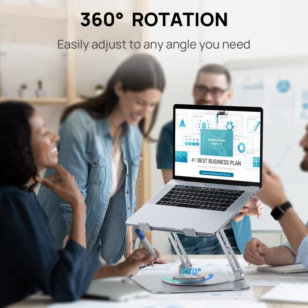 Laptop Stand for Desk Adjustable Holder with 360° Rotating Base Ergonomic Laptop Riser for Collaborative Work Foldable & Portable StandsLaptop stand for desk can fully foldable, it is easily to used, carry. Suitable for working at home, office and outdoor.The adjustable laptop stand is made of aluminum alloy, which makes the stand performance more stable, and the non-slip silicone can protect your laptop from sliding.The stand adopts a 360° rotatable two-axis connection base, which makes the 360° rotation more flexible, and the computer stand allows you to rotate the laptop to any angle.You can adjust the height and angle of the laptop stand to the perfect eye level. Whether sitting or standing, it ensures you are in a comfortable position.Laptop stand compatible with all 9-17.3" laptops, such as MacBook Air/Pro Dell HP Lenovo Huawei etc. Laptop stand for desk can fully foldable, it is easily to used, carry. Suitable for working at home, office and outdoor. The adjustable laptop stand is made of aluminum alloy, which makes the stand performance more stable, and the non-slip silicone can protect your laptop from sliding. The stand adopts a 360° rotatable two-axis connection base, which makes the 360° rotation more flexible, and the computer stand allows you to rotate the laptop to any angle. You can adjust the height and angle of the laptop stand to the perfect eye level. Whether sitting or standing, it ensures you are in a comfortable position. Laptop stand compatible with all 9-17.3" laptops, such as MacBook Air/Pro Dell HP Lenovo Huawei etc.