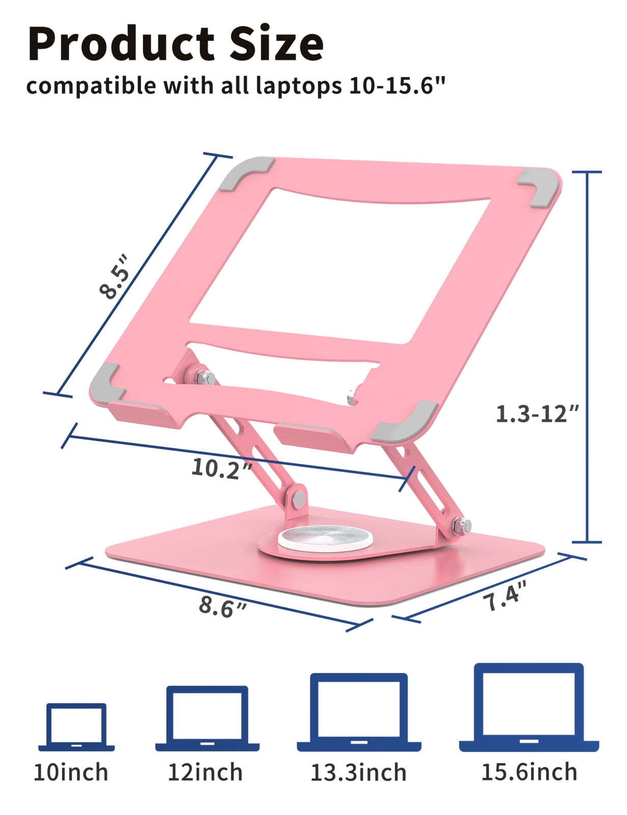 Laptop Stand for Desk with 360° Rotating Base, Multi-Angle Adjustable Laptop Stands, Foldable Laptop Riser Compatible with 10 to 15.6 Inches PC Computer, Pink Welcome to MY STORE No Extra Charge Flat Rate Shipping 24/7 Support Always Able to Help eBay Payment We Accept eBay Payments Method Fast Delivery We Process & Deliver on Time Laptop Stand for Desk with 360° Rotating Base, Multi-Angle Adjustable Laptop Stands, Foldable Laptop Riser Compatible with 10 to 15.6 Inches PC Computer, Pink Product Description Product Features Enhanced Collaboration - The laptop stand boasts a 360° rotatable base, facilitating effortless screen sharing during group projects and collaboration sessions. Heavy and Stable - Made of high-quality metal material, the laptop stands is heavier than its aluminum counterparts, providing unmatched stability. Upgraded joint screws offer further stability, minimizing wobbling and enhancing your work focus. Efficient Ventilation - Boasting a hollow design, the ventilated notebook stand maximizes ventilation, preventing your notebook from overheating and helping it function efficiently, even during extended work sessions. Ergonomic Design - With adjustable height and multiple angles, the computer stand promotes ergonomic working positions, relieving neck, shoulder, and eye strain. Moreover, its foldable design allows you to store it conveniently, decluttering your workspace. Suit for Laptops 10 to 15.6 Inches - Compatible with any laptop computers 10-15.6 inches. Great laptop accessory when you work at home or office, zoom calls, etc. Shipping We do not ship to a different address. We will ship to the address you provide on eBay only. Please check your address before purchase. Fast shipping is very important for us. It should take 3-5 business days for the product to reach your destination. If it takes any longer than that, please do not hesitate to contact us to resolve the issues. Returns All our products come with a 30-Day Return Policy. If you would like to return your item and you are within 30 days of the purchase If you are not 100% satisfied, please let us know the Detailed Problem,We will give you a 100% satisfactory solution. If you received an incorrect, damaged, defective, or item not as described, contact us for a partial/full refund or replacement on our cost. Free Shipping and Free Return 30-Days Money Back Guarantee. Payment We accept eBay payments such as PayPal, Google Pay, Visa, MasterCard, and American Express. Payment is processed through eBay's secure system. Please ensure that your shipping address is correct before making the payment, as we are unable to change it after the order is processed. For any payment-related issues, please contact eBay customer support. Feedback Your feedback is very important to us. After you receive your package and are satisfied with our service, please leave us positive feedback. If you have any problem with your order or any questions, please contact us before leaving any type of feedback. Contact Us If you have any questions related to our products, please don't hesitate to contact us through eBay message.
