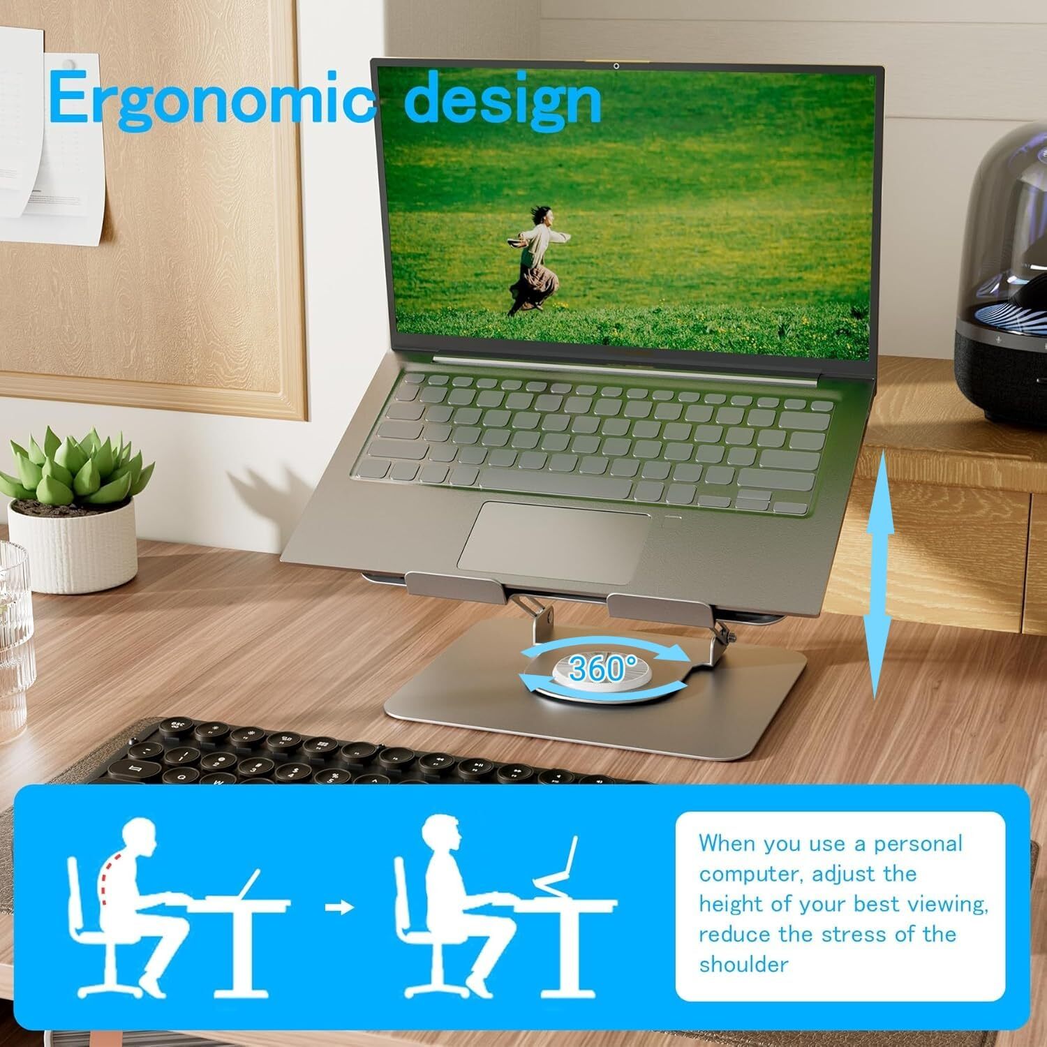 Wide compatibility: The laptop stand for desk is compatible with all laptops and tablets from 10 inch up to 17 inch. Such as MacBook, MacBook Air/Pro, Dell, HP, Acer and other notebooks & tablets Adjustable & Portable Design: The Laptop Stand has 360 rotating base and foldable bracket. That means it can be adjusted to comfortable height and angle based on your need. Besides, you can easily fit the folded laptop stand into your bag Heat Dissipation: The top of the laptop Holder is designed with big ventilation hole. The open efficient design offers greater ventilatin and more airflow to make sure your laptop efficient operation Sturdy & Reliable: Our adjustable laptop stand for desk has powerful suport for holding up to 22lbs (10kg). 4 rubber pads makes sure your laptop or tablet can stay on the top, and no worry about drop off Ergonomic Design: The foldable laptop stand is comfortable for use experience. It not only elevate laptop screen to your eye level,but easy to you fix posture and relieves,sholder. it's a useful partner for your working and learning by laptop
