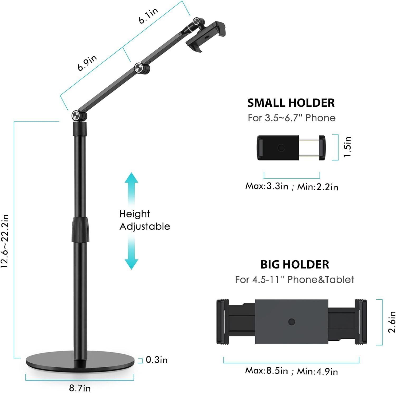 This overhead stand is a game-changer for anyone who uses their phone or tablet for videos, calls, or streaming. It fits most devices from 3.5 to 11 inches, so my iPhone and tablet both work perfectly. The 360-degree rotation and height adjustment make it super easy to find the ideal angle—no more neck strain! The sturdy black design looks sleek and holds devices securely. Perfect for live streaming, video calls, or even just watching movies hands-free. Highly recommend for anyone who wants a flexible, durable stand!