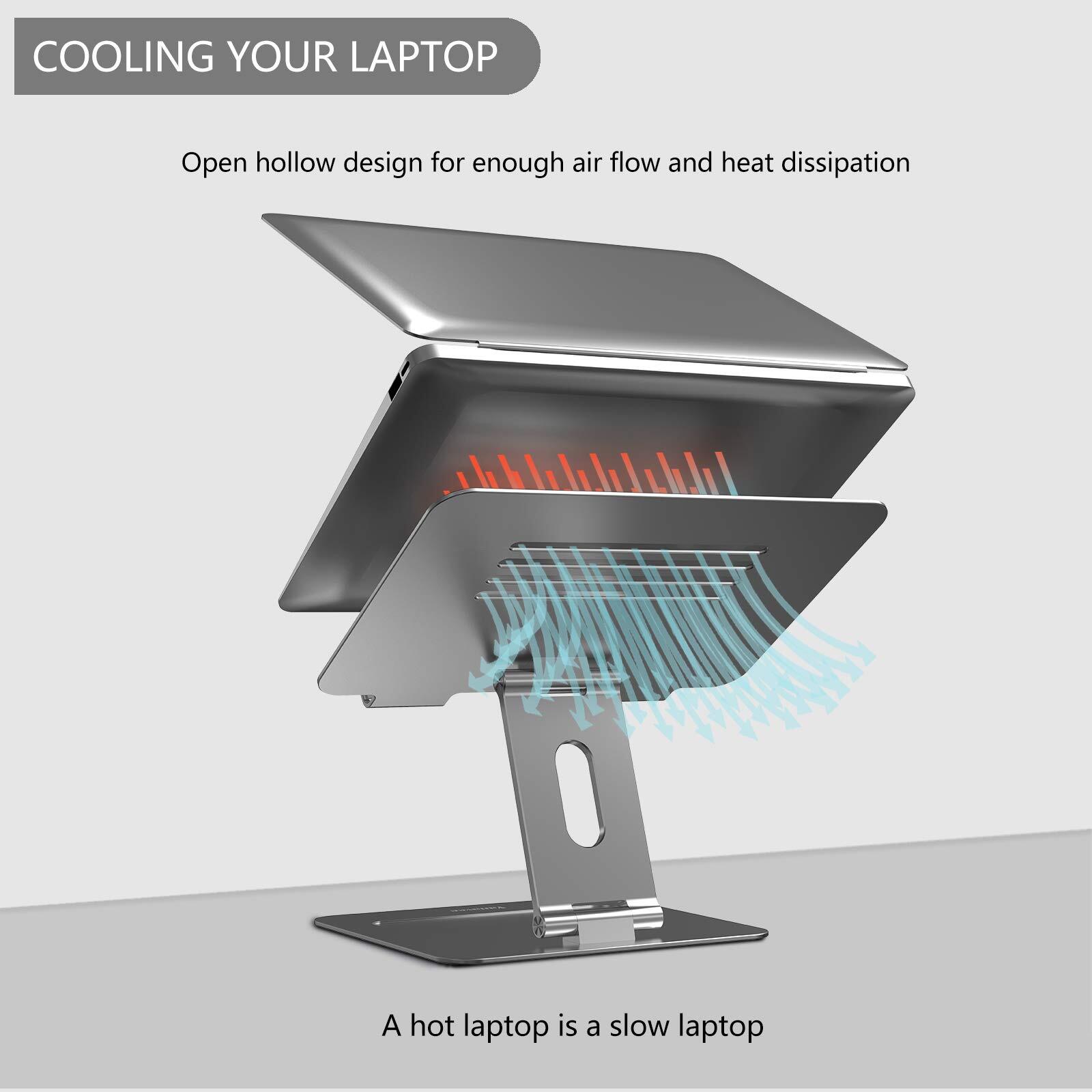 Ergonomic and Adjustable: The laptop stand has various adjustable height and angle, can elevate your notebook screen height to a perfect eye level for better ergonomics, prevent you from hunching over your screen, which reduces neck and shoulder pain, fits to your home and office use perfectly Sturdy & Stable: The laptop desk stand is designed in a stylish Z-type and built with high quality aluminium alloy, strong and sturdy to hold laptops up to 30 lbs, it will not wobble while you are typing on the laptop; the non-slip rubber on the bottom ensure your laptop hold in place and the protective hooks prevent the laptop from sliding out Special Groove Design & Ventilated Cooling: The adjustable laptop stand is designed with special groove storage to place phones, pens, and mouses etc. for saving space on your desk, the aluminum plate with ventilation hollow design can efficiently ventilate the heat generated by the laptop to prevent overheating Easy Open & Foldable: The laptop riser is equipped with high quality hinges which can be opened easily and freely, stiff and stable but not hard to adjust, can be easily elevated to your prefer height level, the laptop riser can also be folded flat for convenient storage, or carry it everywhere Broad Compatibility & Multi Use: This laptop computer stand for desk is compatible with all laptops from 10-17 inches, multi-use in many occasions such as office, meeting room and kitchen to hold the laptops, tablets, projectors, menu, books etc