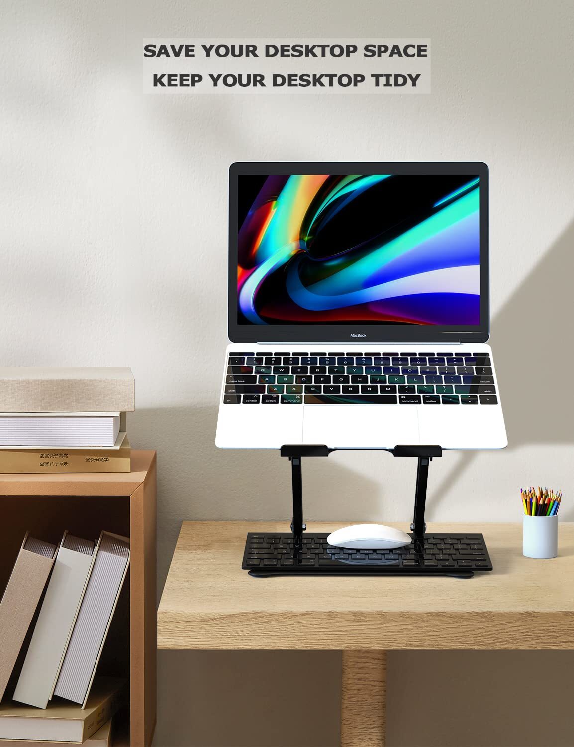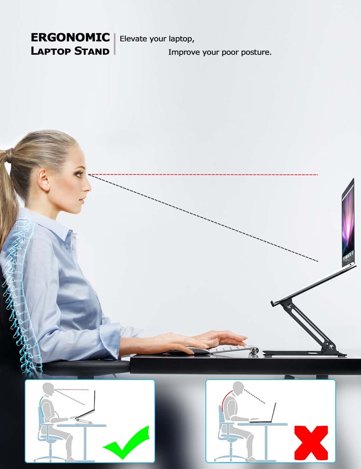 aluminum laptop stand is designed to benefit the users to cool the system down after use to prevent overheating. Laptop stands are used to position such a way that it helps in improving poor posture. The portable laptop stand will help the users ergonomics. Ergonomics is something that aims to build both productivity and comfort for laptops, which ensures lowering the risk of repetitive stress injury that arises when users perform tasks like typing a keyboard over and over again. A laptop stand will lift the notebook display to eye level, avoiding pressure on the back and neck from a strained downward perspective. The laptop stand helps correct your body posture, reduce the likelihood of neck and back pain, plus enhances the performance of your laptop. Adjustable in Height & Angle: the laptop stand for desk comes with a Z-type design so you can tilt to gain extra height for the display from 2" to 11", providing the most comfortable viewing height for you. Elevated in a good height, it is also convenient to use extra keyboard and mouse. Enhanced Stability: featuring larger thickened aluminum base & tight bolts, the macbook stand for desk is sturdy to hold laptops up to 13 lbs (7kg). With 4 anti-slip rubber pads, laptop stand adjustable height can keep your laptop stable and prevent from any slip or scratches. Ergonomic Laptop Stand: the adjustable laptop stand can raise laptop to your eye level, allowing you to get comfortable typing, watching and working posture, lowering the risk of repetitive stress injury to your neck, shoulder or back. Ventilated Hollow Design: the laptop cooling pad is made of high-quality aluminum that can absorb and discharge heat easily. The two holes on the surface of computer stand for laptop also allows air flow naturally to protect your laptop from overheating. Universal Compatibility: the macbook stand for desk is compatible with all laptops from 10" up to 17.4", such as iPad Air, MacBook Pro, Surface, Lenovo, HP, ASUS, Dell XPS, Acer, Chromebook.
