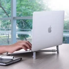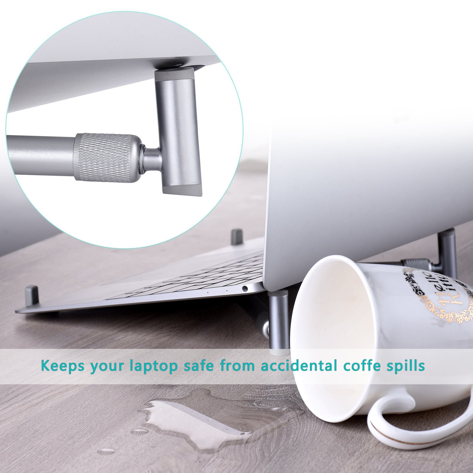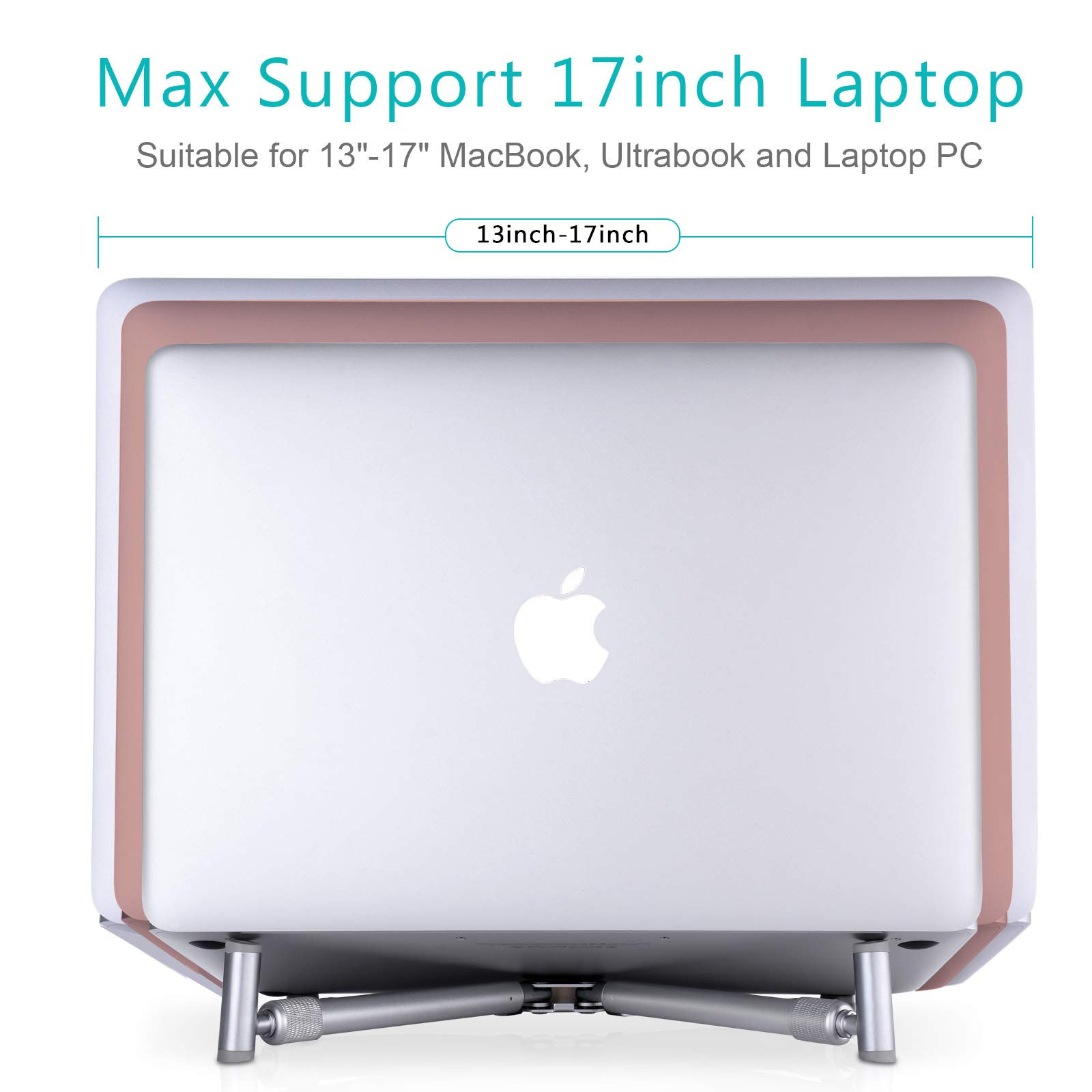 Laptop stand gets a pretty broad base and can comfortably and non-precariously support Macbook Pro, Macbook Air, and other laptops with up to 17" screens (NEW VERSION) The portable laptop stand guarantees better airflow to cool down your computer and makes the most benefit for your laptop's fans point downwards Tilts the laptop at nearly the perfect angle for more comfortable and ergonomic typing.Helped you to type faster and to have a better position for your hands, also to have your head higher to avoid neck issues Adjustable legs allowed you to place these out of reach of the nubs that were attached to a laptop and indicate where each position you would want to secure it. The front grips also stick up high enough to prevent your laptop from sliding off Compact and portable when folded around into a nice 6.2 inch and 5.8oz tubular design which is easily put into your backpack for on-the-go.