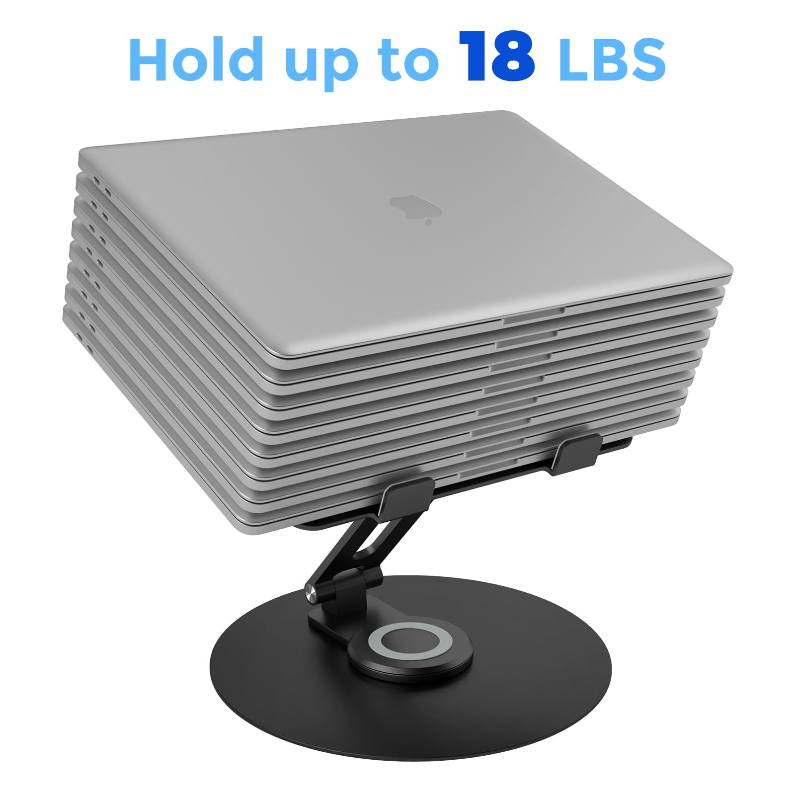 360° Rotatable: With a 360° rotatable turnable attached to the base, this laptop stand is supported by strong axis, allowing its top half to swivel flexibly to any angle,so it's perfect and convenient for you to share the laptop's screen to your partners especially for collaborative work at the meetings. Wide Compatibility: This laptop stand fits all laptops from 10 -17 inches, and it's compatible with brands such as MacBook Pro/Air, Dell, Lenovo, HP, ASUS and more notebooks. Foldable & Sturdy: This lightweight laptop can be fully folded up for easy storage, which makes it portable and convenient to carry and used anywhere. Made of thickened aluminum alloy, it's super sturdy to support as much as 18lbs and holds your laptop firmly in place. Adjustable & Ergonomic Design: Designed to be adjustable in height and angle, this laptop stand promotes you a healthy sitting posture since it elevates your laptop up to a more comfortable eye level, which prevents you from hunching over the screen or any pain in your neck or back. Heat Dissipation: This laptop stand elevates your laptop with a rectangle-shaped support plate adopting the open hollow design to allow the air to freely circulate beneath it, protecting your laptop from overheating effectively.