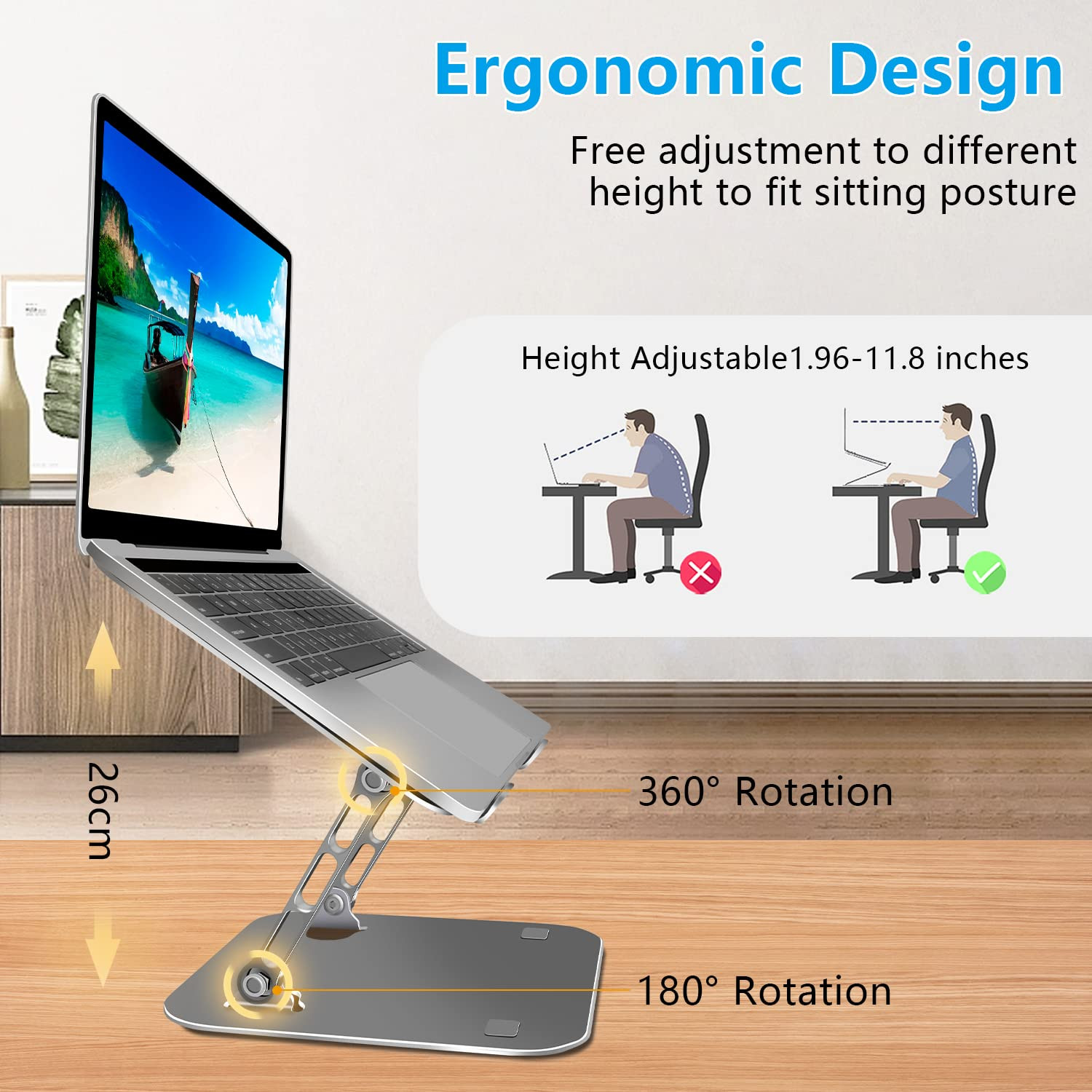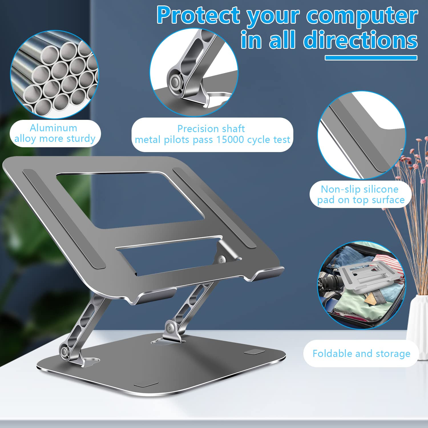 [Lightweight Design with Excellent Stability] The entire laptop stand is made of high quality aluminum alloy and the lightweight design makes it approximately 20% lighter than the conventional laptop stand in the same series, making it convenient to carry and use on the go Ergonomic Design] The MacBook stand holder works as a raiser to elevate the laptop screen to your eye level. This Laptop Stand could be adjustable in height and angle of your laptop for your better ergonomics to minimize neck fatigue, say goodbye to neck pains [Keep Laptop Cool] While it is made of thick and solid, it has a large hole in the center so you can put your laptop or other things that are concerned about heat dissipation. Silicone rubber non-slip pads are attached to the upper and lower sides (grounding and computer side) grounding surface to prevent slippage and provide stability. The structure also allows space under the PC stand to expand documents or store the keyboard when not in use [Broad Compatibility] The folding design allows for space saving storage.The laptop stand fits a variety of laptops, compatible for MacBook/ Macbook Pro/ Lenovo/ HP laptops up to 16 inches, etc. [Correct Use of Tools] The laptop stand only needs to be adjusted by hand, and the package comes with a reinforced nut tool, so please keep it in a safe place for future use. It can effectively prevent the product from loosening due to frequent adjustment, ensuring the durability of the product.