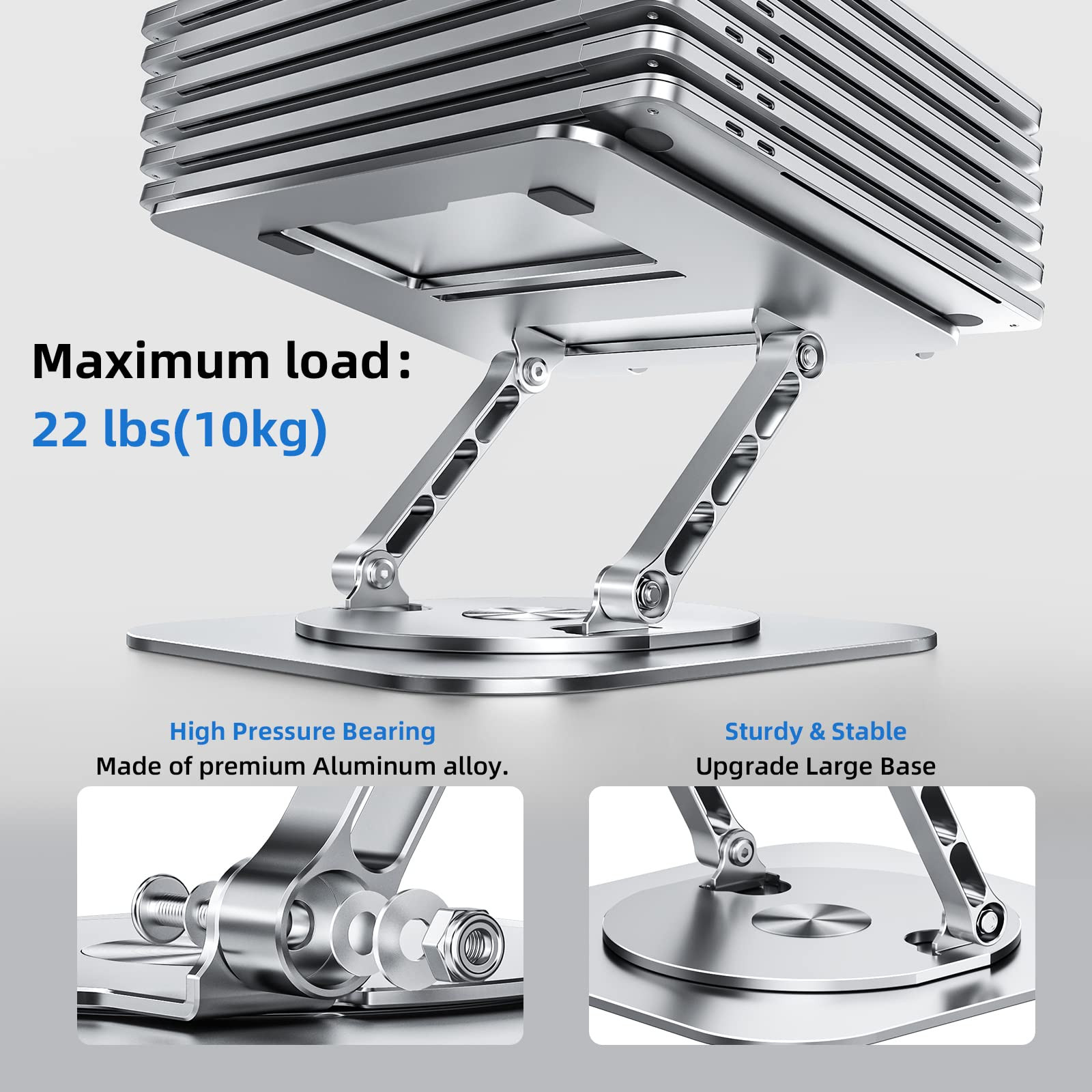 360°Rotation:Laptop stand for desk 360° rotatable, Two-axis connecting with the base, makes the rotation more flexible, allows you to swivel your laptop to any angle. It is very suitable for sharing content in meetings or communication Ergonomic Adjustable Height: This foldable laptop stand could be adjustable in height and angle of your laptop, raising your laptop screen height flexibly from 1.18" to 21", for your better ergonomics to minimize neck fatigue, say goodbye to neck pains. Stable:The office computer stand is made of high-quality thickened aluminum, and the larger turntable base can support 22 lbs (10kg) which are more stable and sturdier without worrying about any wobbling at all; The rubber on the holder hand is firmly stuck to protect your laptop from scratching and sliding off. Heat Dissipation:The laptop riser rotary plate adopts an open hollow design which can enhance the air circulation to achieve the best heat dissipation effect, solve the concern of the weakened heat dissipation performance due to your long-playing use of computer. Broad Compatibility:The laptop raised to stand compatible with MacBook Pro/Air, Dell, ASUS, Lenovo, Dell, HP, Microsoft, Toshiba, Samsung and all laptops 10 to 17.3 inches, whether working in home studies, office or conference room even on the messy desk, it is your best choice.Thank you for experiencing our innovative products. If you have any questions, please reach us immediately and we will give you a solution in 24 hours.