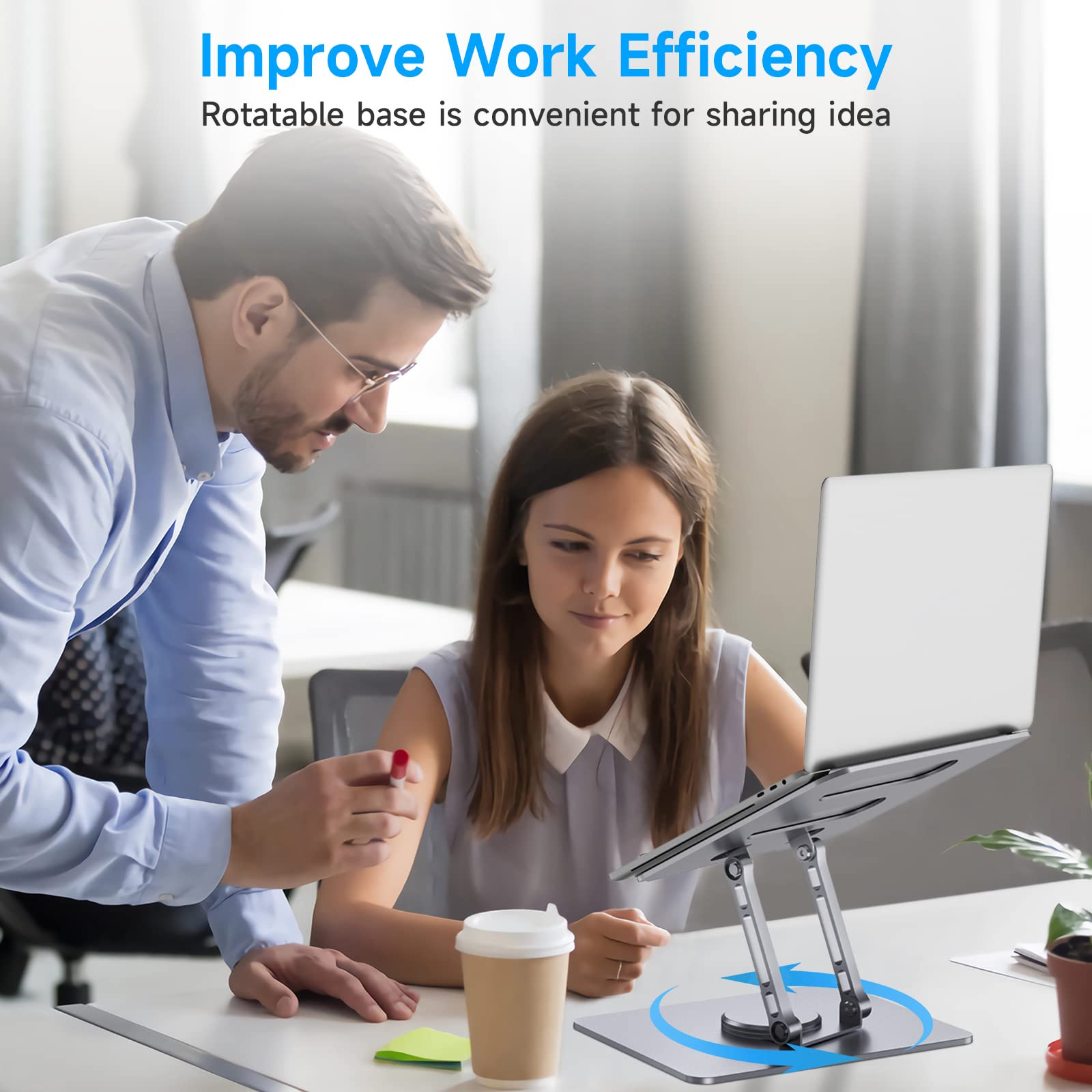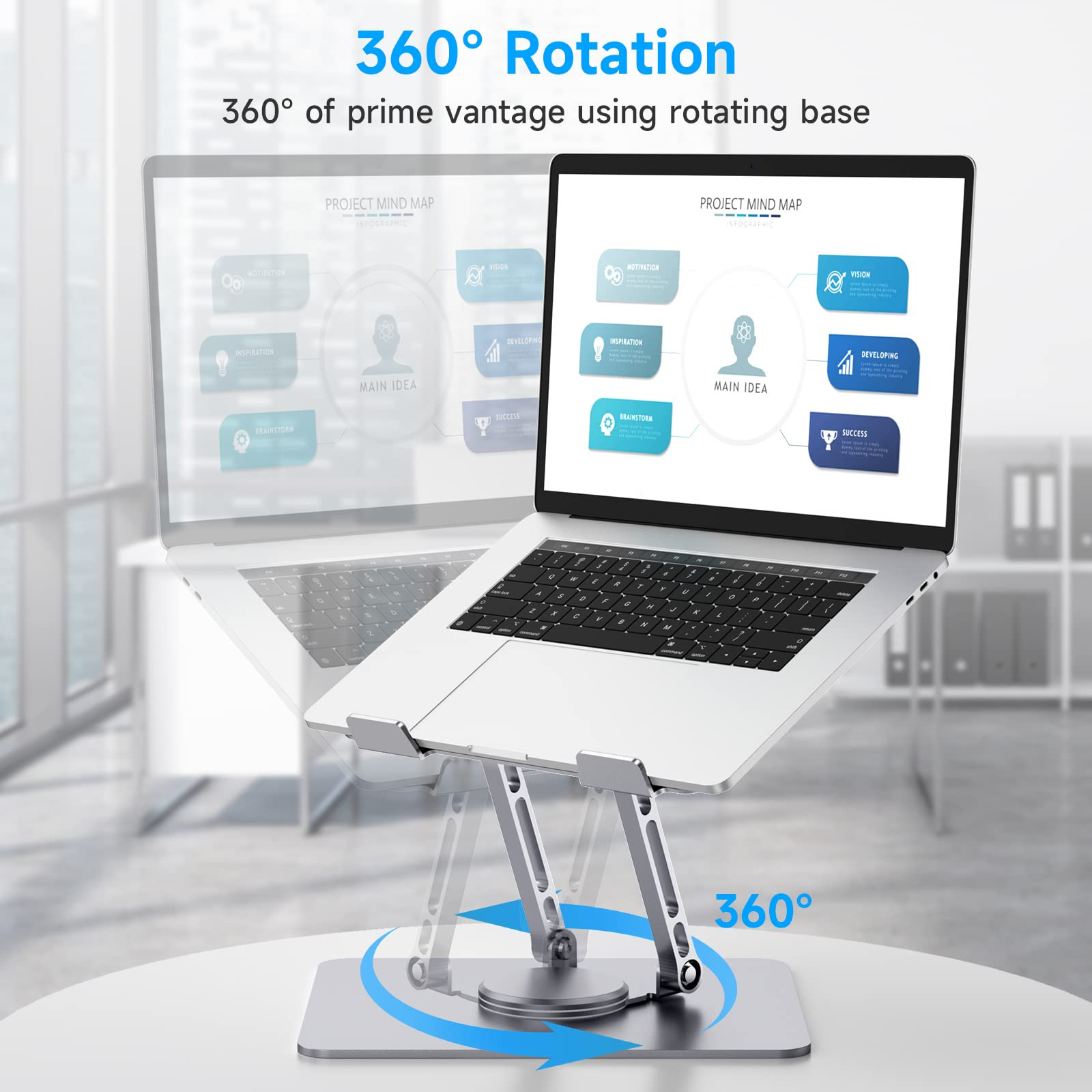【Keep Your Desk Clean】The laptop stand is perfect for the cluttered kitchen counter, table or small desk with its foldable design that also swivels to give everyone around the table easy access the laptop's screen. This Swivel laptop stand can bring your laptop up to the level matching your monitor, holding your laptop as a second screen to smooth your flow while working or studying. 【360°Rotation】Featuring a 360° rotatable Two-axis connecting with the base, makes the 360°rotation more flexible, computer stand allows you to swivel your laptop to any angle. The rotating laptop stand for desk allows you to easily share your screen with someone sitting across the room or at another desk. It also works great for ideas sessions when collaborating with others over video chat or calls. 【Wide Compatibility】The laptop raised stand supports all devices from 10-15.6 inches. Made with premium aluminum alloy which make it more stable. The laptop stand also contains hooks and a non-slip silicone cushion, ensuring your device (up to 22lbs) will never slide when you're using it. 【Ergonomic Design】You can adjust the height and angle of the laptop riser to set the most comfortable position while using your laptop. Because of its ergonomic design, the laptop stand adjustable helps reduce your chance of developing back, neck and spinal problems. Which ensures you in a comfortable position no matter sitting down or standing up. 【Foldable & Portable】Laptop stand for desk can fully foldable, it is easily to used, carry. You can take your laptop and this portable laptop riser wherever you go. You can set it up wherever you are as a comfort aid. The laptop stand is simple to transport whether you wish to work in a coffee shop or a library.