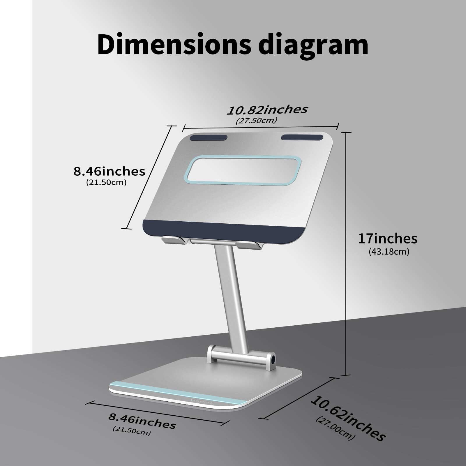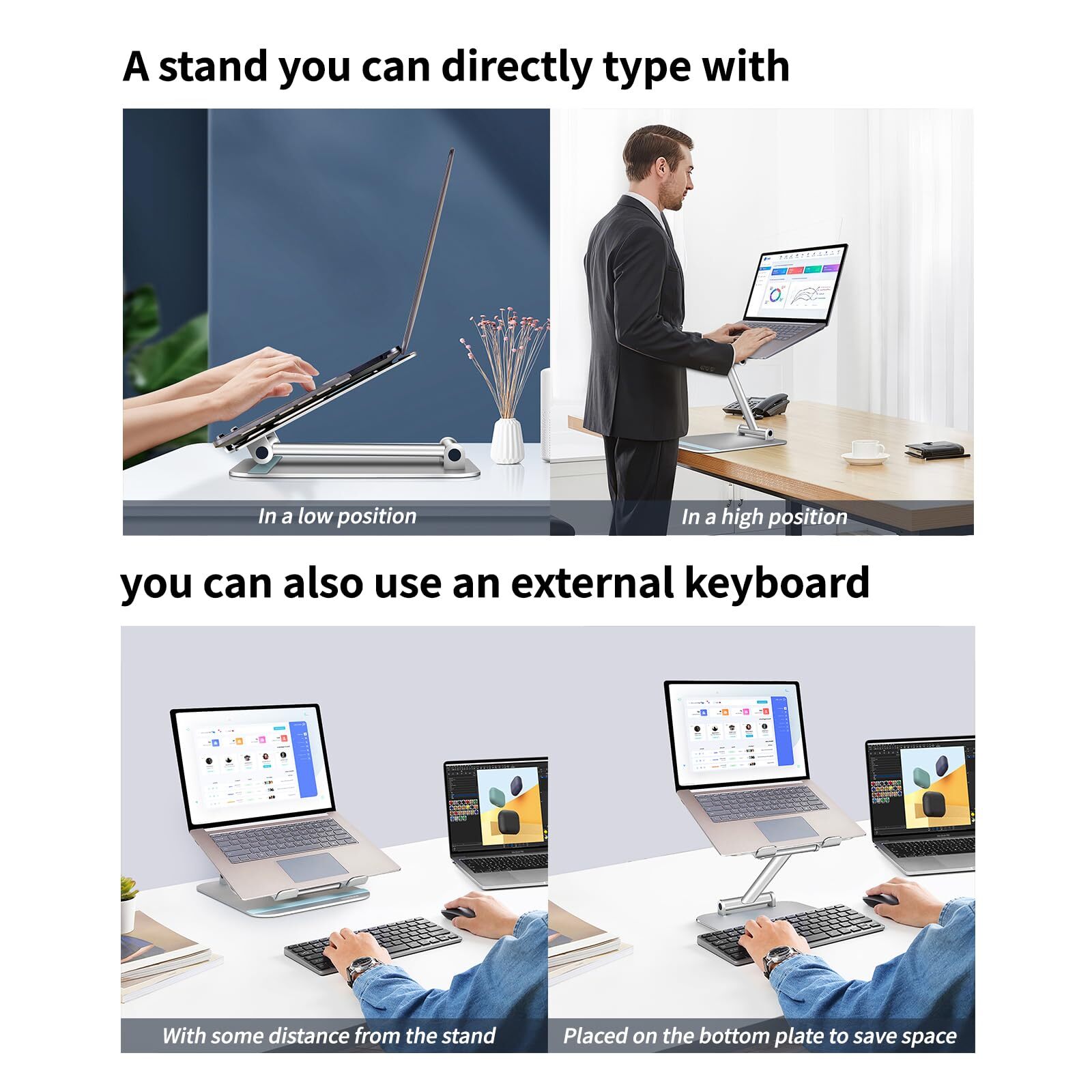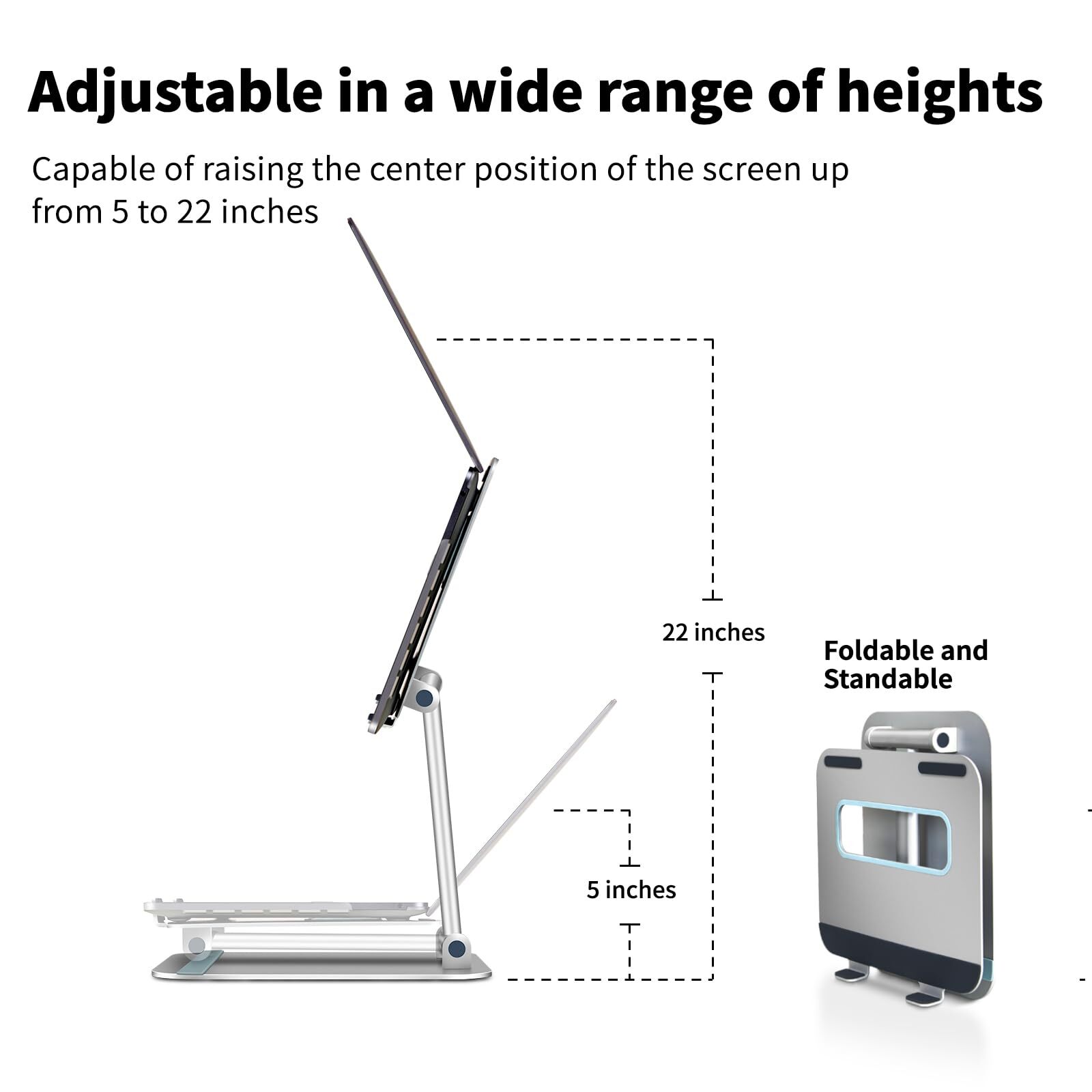 Product Description: Introducing our high-rise adjustable stand, a versatile accessory designed to elevate your laptop or iPad to your preferred height and position with ease. Whether you're working, studying, or enjoying multimedia content, this stand provides a stable and comfortable platform for your beloved devices Elegant Design and Stability: Meticulously engineered for aesthetics and stability, our stand ensures that the panel always remains within the base's weight-bearing range, guaranteeing 100% stability. Its sleek design complements any workspace while offering ergonomic support for your neck, shoulders, spine, and eyes. Versatile Usage Scenarios: Suitable for a variety of settings including offices, study spaces, conference rooms, presentations, kitchens, video watching, gaming, bookshelves, and podiums, this stand adapts seamlessly to your needs. Multiple Usage Methods: Whether sitting, standing, or reclining, our stand accommodates your preferred posture. You can use it with an external keyboard or type directly on your laptop keyboard without any shaking. The front-end fixed teeth ensure secure positioning without compromising typing or touchpad usage, while the keyboard anti-slip strips provide additional stability. Universal Compatibility: Compatible with most brands and sizes of electronic devices, from large 17.3-inch laptops to smaller tablets and smartphones. The silicone design of the middle frame caters specifically to smaller devices such as notebooks, iPads, phones, and books. Foldable and Portable: Our stand is foldable for easy transportation and storage, taking up minimal space when not in use. Its unique pivot design supports up to 15 kilograms while offering smooth linear folding and opening, allowing you to adjust the position and angle effortlessly to suit your comfort. Enhanced Stability and Comfort: The front-facing silicone pads prevent slipping when using an external keyboard, ensuring a stable and comfortable typing experience. The four enlarged silicone pads on the back protect the tabletop and prevent slippage. Ideal Gift: Perfect for heavy mobile device users, corporate professionals, and students. It makes a practical and thoughtful gift for occasions such as Christmas, Thanksgiving, back-to-school season, employee rewards, Mother's Day, and Father's Day. ✔️Ergonomically designed: Crafted from high-quality aluminum alloy, this stand is tailored for your convenience, comfort, and well-being. This laptop stand requires no installation, it can securely holding your laptop at any desired position, offers ample protection for your neck, shoulders, lumbar spine, and eyes. ✔️Extensive height adjustment range: Featuring a long support pole, it provides a broader range of height adjustments. The screen's center position can be fixed steady anywhere between 5 and 22 inches, ensuring optimal comfort for work, study, and daily use. ✔️Strong damping hinge, reinforced base design: With a maximum load-bearing capacity of 33 pounds (15 kilograms), it allows for stable typing without shaking or wobbling. The panel remains within the base's load-bearing range, ensuring stability. ✔️Compatible with most sizes of mobile electronic devices and lifestyle scenarios: Including laptops, iPads, smartphones, projectors and books, up to 17.3 inches. Suitable for offices, study rooms, meeting rooms, presentations, kitchens, video watching, gaming. ✔️Dual-color anti-slip buffer silicone design: Not only aesthetically pleasing but also offering comprehensive protection for your devices and a comfortable user experience ✔️Suitable for a wide range of users: Ideal for office workers, remote workers, teachers, students, freelancer, gamers. It's a practical and useful gift for Birthday, Christmas, Thanksgiving, back-to-school season, employee rewards, Mother's Day and Father's Day.