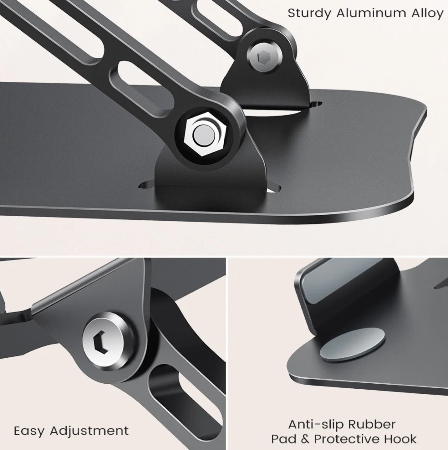 Material: Aluminum alloy Color: Black Weight: 1.4 lb Size: 10.23 x 8.67 x 1.3 inch Maximum height: 12 inch Weight capacity: 17 lb Package includes stand: 1 x laptop stand 1 x spanner for tightness adjustment Computer not included