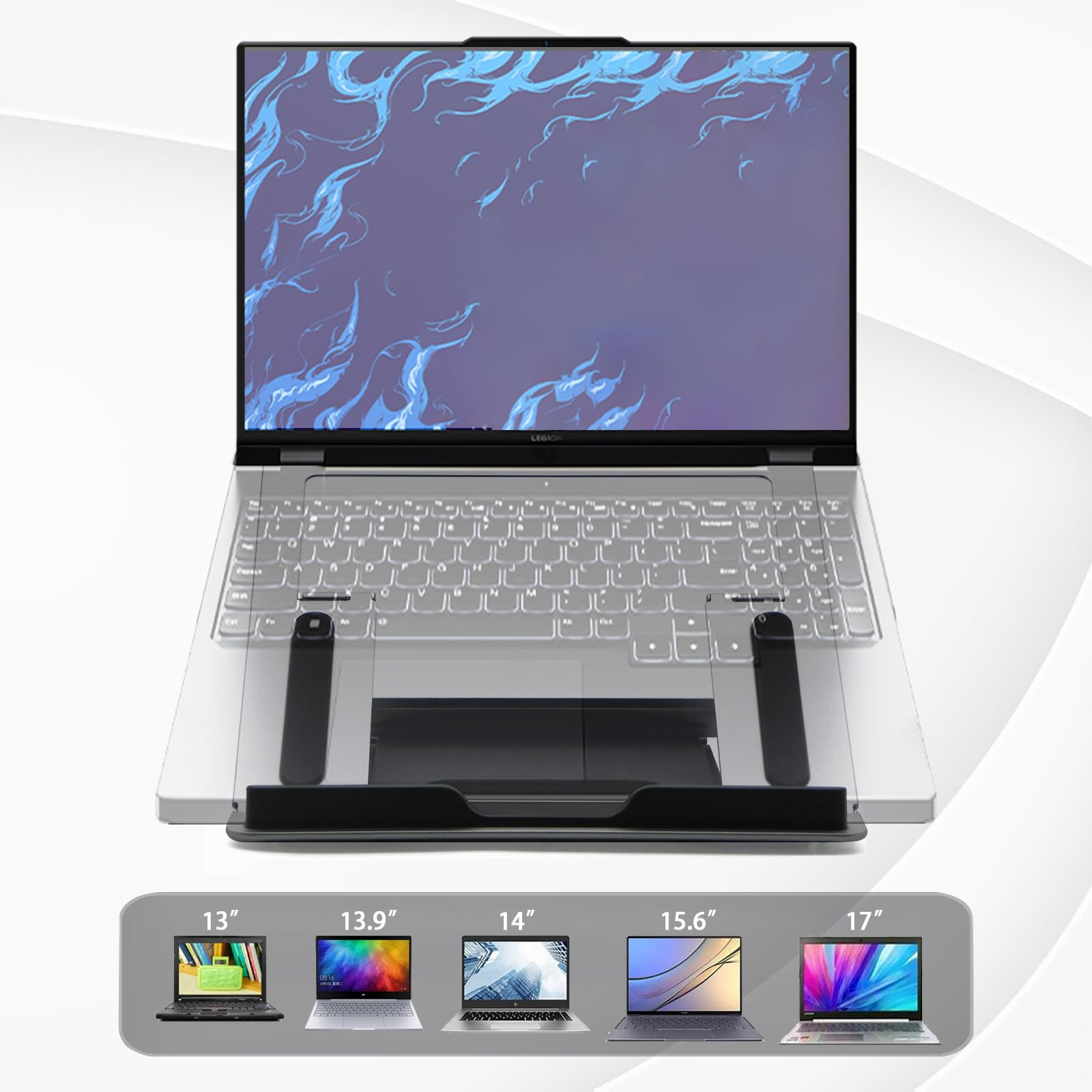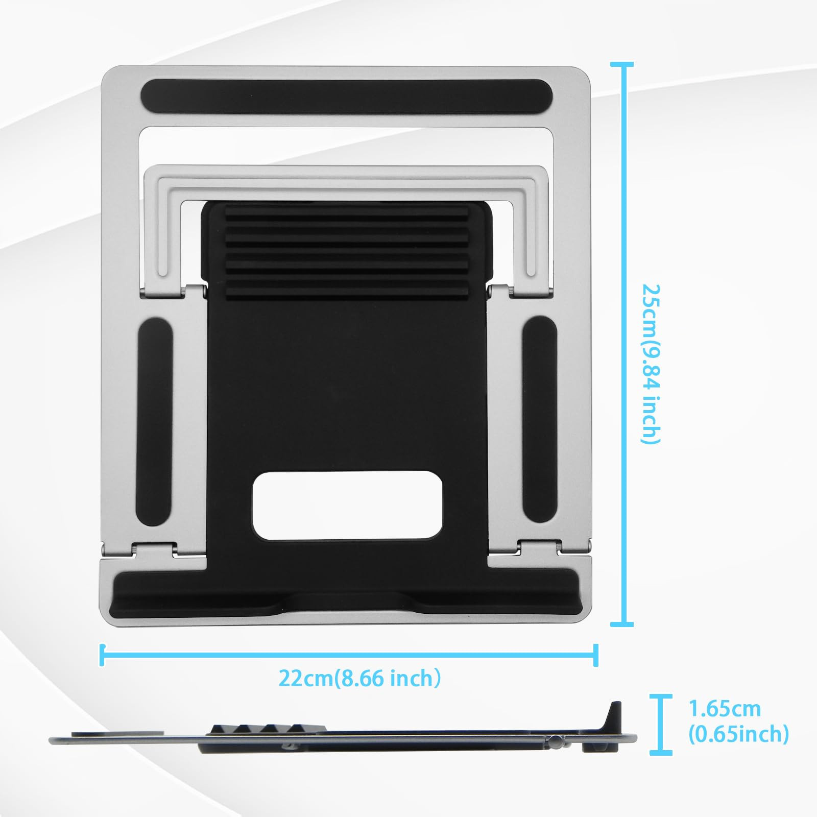 【Wide Compatibility】-This laptop stand versatile design ensures compatibility with all notebooks from 10 to 17 inches, such as MacBook/ MacBook Air/ MacBook Pro/ Microsoft Surface/HP/ Dell XPS/ Google Pixelbook/Lenovo ThinkPad/ASUS/Chromebook etc. Be your ideal companion in home, office & outdoor. 【Sturdy & Protective】- The computer riser is made from high-quality materials for long-lasting durability. The triangle support design supports up to 11 lbs (5 kg) without shaking the panel, and 4 non-slip silicone pads at the bottom help prevent the computer from scratches or sliding. 【Foldable & Portable】- The laptop riser is only weighs 1.60 pounds and and can be quickly folded into a small size of 9.7” x 8.2” x 0.3”, very easy to carry, can be easily stored flat in suitcases, backpacks and even handbags, making it the perfect companion for remote work or travel. 【Heat Dissipation】- The computer stand structure provides great heat dissipation , hollow design and adjustable height increase airflow, keeping your laptop cool during long working hours. You don't have to worry about the laptop getting hot and causing it to get stuck. 【Adjustable & Ergonomic】- The holder's height and angle can be easily adjusted to offer an ergonomic setup, There are 4 heights adjustment, from 19 to 30 degrees, let you fix posture and reduce your neck fatigue, back pain and eye strain ,extremely convenient for using your tablet in a variety of position.