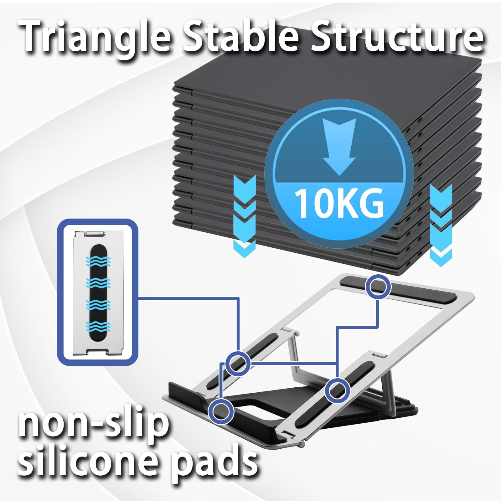 【Wide Compatibility】-This laptop stand versatile design ensures compatibility with all notebooks from 10 to 17 inches, such as MacBook/ MacBook Air/ MacBook Pro/ Microsoft Surface/HP/ Dell XPS/ Google Pixelbook/Lenovo ThinkPad/ASUS/Chromebook etc. Be your ideal companion in home, office & outdoor. 【Sturdy & Protective】- The computer riser is made from high-quality materials for long-lasting durability. The triangle support design supports up to 11 lbs (5 kg) without shaking the panel, and 4 non-slip silicone pads at the bottom help prevent the computer from scratches or sliding. 【Foldable & Portable】- The laptop riser is only weighs 1.60 pounds and and can be quickly folded into a small size of 9.7” x 8.2” x 0.3”, very easy to carry, can be easily stored flat in suitcases, backpacks and even handbags, making it the perfect companion for remote work or travel. 【Heat Dissipation】- The computer stand structure provides great heat dissipation , hollow design and adjustable height increase airflow, keeping your laptop cool during long working hours. You don't have to worry about the laptop getting hot and causing it to get stuck. 【Adjustable & Ergonomic】- The holder's height and angle can be easily adjusted to offer an ergonomic setup, There are 4 heights adjustment, from 19 to 30 degrees, let you fix posture and reduce your neck fatigue, back pain and eye strain ,extremely convenient for using your tablet in a variety of position.