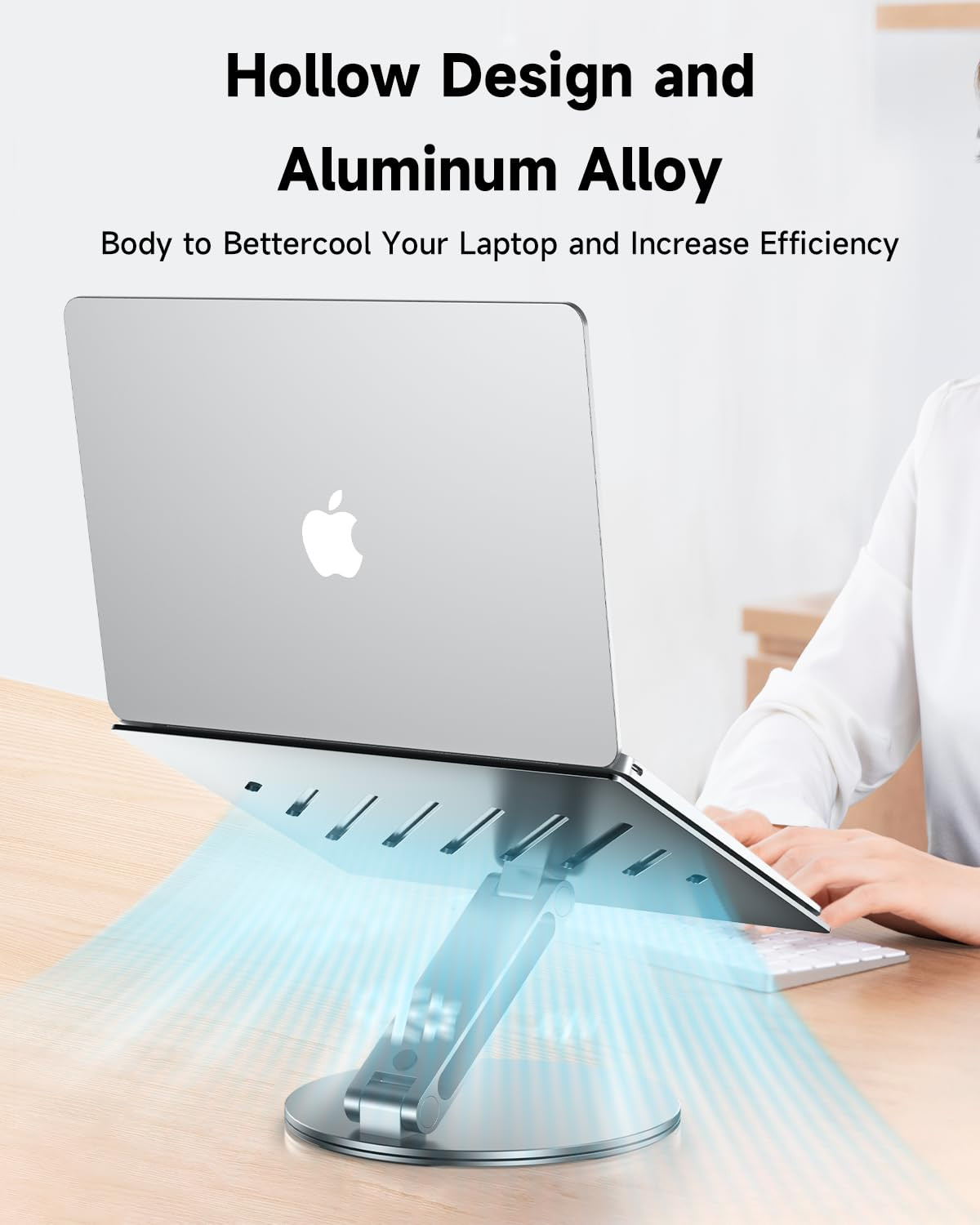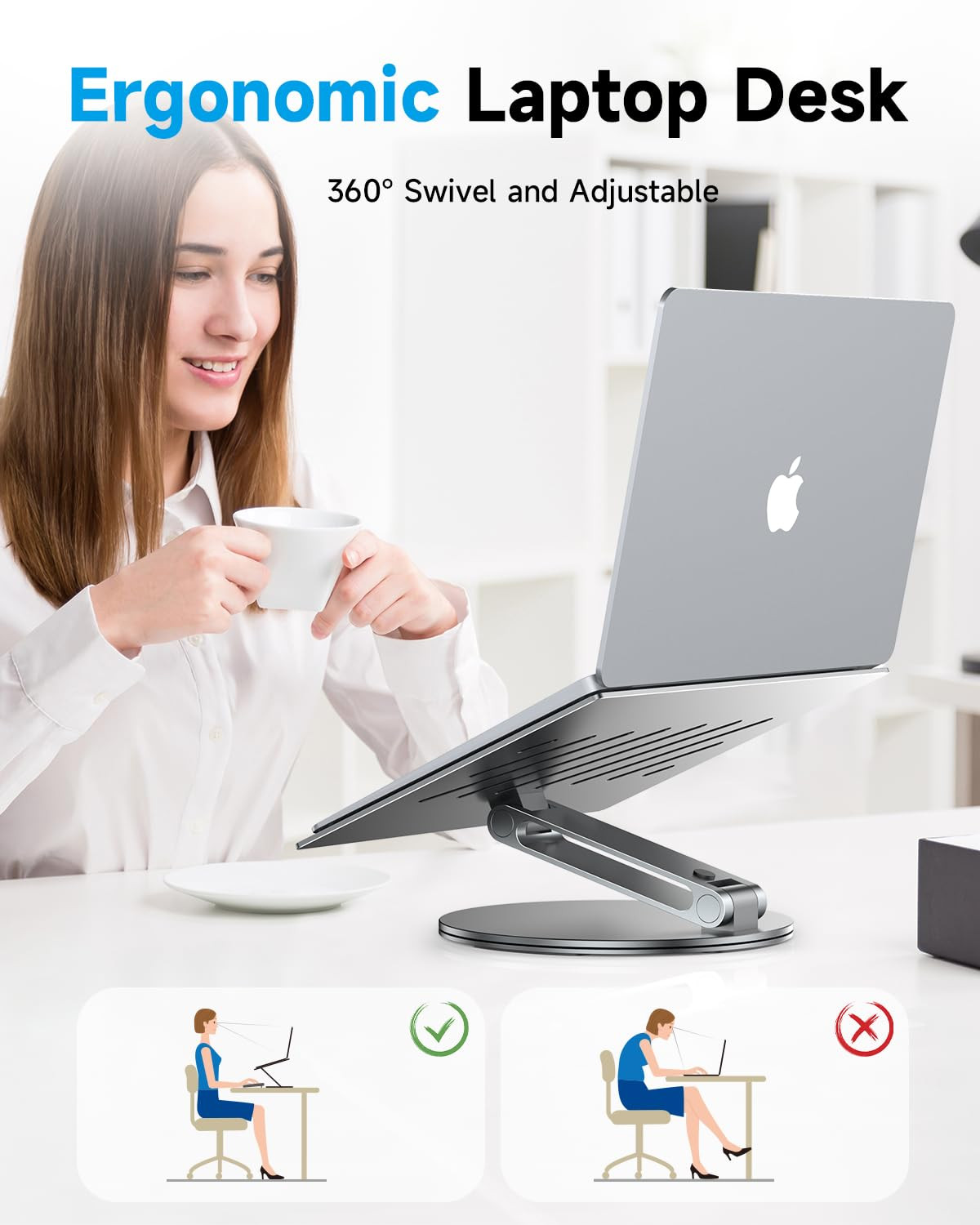 【 Ergonomic & Adjustable for Maximum Comfort】 – Easily adjust the height and angle of your laptop stand for desk, reducing neck and back strain. Ideal for office workers, students, and designers who use computers for extended hours. 【 Sturdy & Stable Design】 – Made from premium aluminum alloy, this heavy-duty laptop riser supports up to 17.6 lbs (8 kg) without wobbling. The non-slip pads and reinforced structure ensure your MacBook stand for desk remains secure. 【 360° Rotating Base for Collaboration】 – Featuring a swivel design, this adjustable laptop stand allows you to share your screen effortlessly during meetings, presentations, and collaborative work. A must-have for professionals and educators. 【 Foldable & Portable for Easy Carrying】 – This collapsible laptop desk stand folds completely flat, making it easy to store and transport. Whether at home, in the office, or traveling, enjoy a flexible laptop riser that fits your dynamic lifestyle. 【 Efficient Heat Dissipation】 – Designed with a ventilated platform, this computer stand for laptop promotes airflow, preventing overheating and enhancing your laptop’s performance. Perfect for gaming laptops, MacBooks, and Chromebooks. 【 Maximize Workspace & Improve Organization】 – Elevate your laptop to create extra space for keyboards, books, or office supplies. This desktop laptop riser helps declutter your workspace, increasing productivity and efficiency. 【 Universal Compatibility & Multi-Device Use】 – Compatible with all 10-17.3 inch laptops, Perfect for MacBook Pro/Air, Dell, HP, Lenovo, Acer, ASUS, Surface, and gaming laptops. Also works as a tablet or monitor stand. 【 Modern & Professional Aesthetic】 – The sleek grey aluminum finish complements any office or home décor, adding a high-end and stylish look to your workspace. Designed for those who appreciate premium quality and aesthetics.