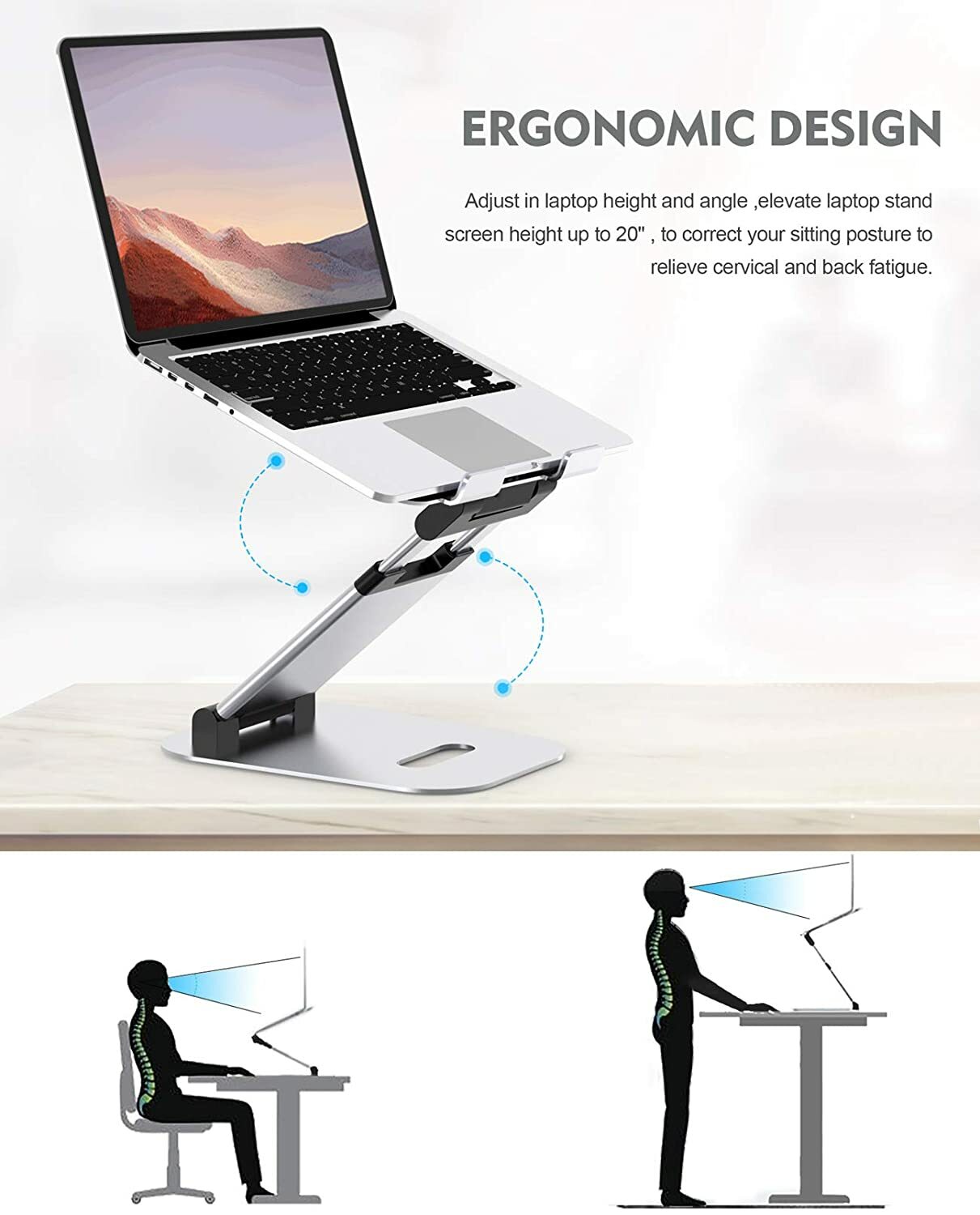 Laptop Stand for Desk, Multi-Angle Adjustable Laptop Stand with Heat-Vents, Ergonomic Computer Stand Laptop Riser- Adjustable Height up to 20'', Sit to Stand Laptop Holder Compatible with Laptops up to 17''. About this item Ergonomic Laptop Stand: Adjustable Height and Angle, Foldable laptop holder can meet your any demands.Adjustable angle tilt allows each individual to achieve the most optimal and comfortable laptop position.You can use it while sitting or standing. Sit to Stand Laptop Stand: This laptop riser can raise your laptop screen height flexibly up to 20", that ensures you a comfortable position no matter sitting down or standing up, to get the maximum visual comfort, improves your body posture and helps to relieve neck, back pain and eye strain. Reliable Laptop Desk Stand : Made of solid aluminum that provides a sturdy surface for your laptop. Adopting ventilation design reduces your laptop from overheating and improves functionality. Foldable and Portable: Fashion and modern design, wherever you go easily collapsed and carried.It is a necessity for home office supplies and office accessories.It fits almost all laptop size from 10 to 17 inches. Universal Compatibility: The laptop stand can work with all laptops and tablets from 10-17 inches,which is compatible with MacBook, MacBook Air, Macbook Pro and more. This Laptop stand standing desk can be used as a stand up desk,adjustable office desk,foldable computer desk,you can pack it into your backpack from working at home or working at office. Product Description