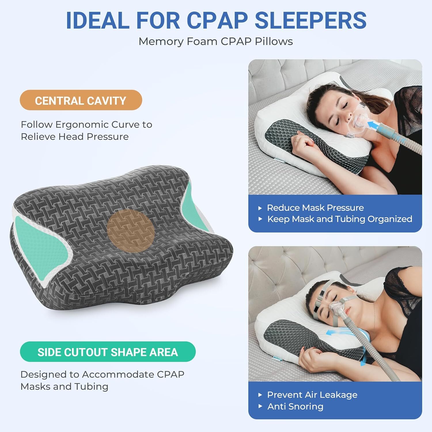 This pillow is a game-changer for CPAP users! The adjustable height and memory foam provide perfect neck support while the side cutouts keep tubing secure and reduce mask pressure. No more tangled tubes or air leaks—just comfy, uninterrupted sleep. The ergonomic design aligns the spine naturally, and it works with all CPAP mask types. Finally, a pillow that actually improves CPAP therapy! Highly recommend for anyone struggling with discomfort or mask leaks.