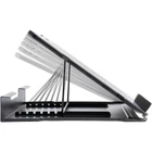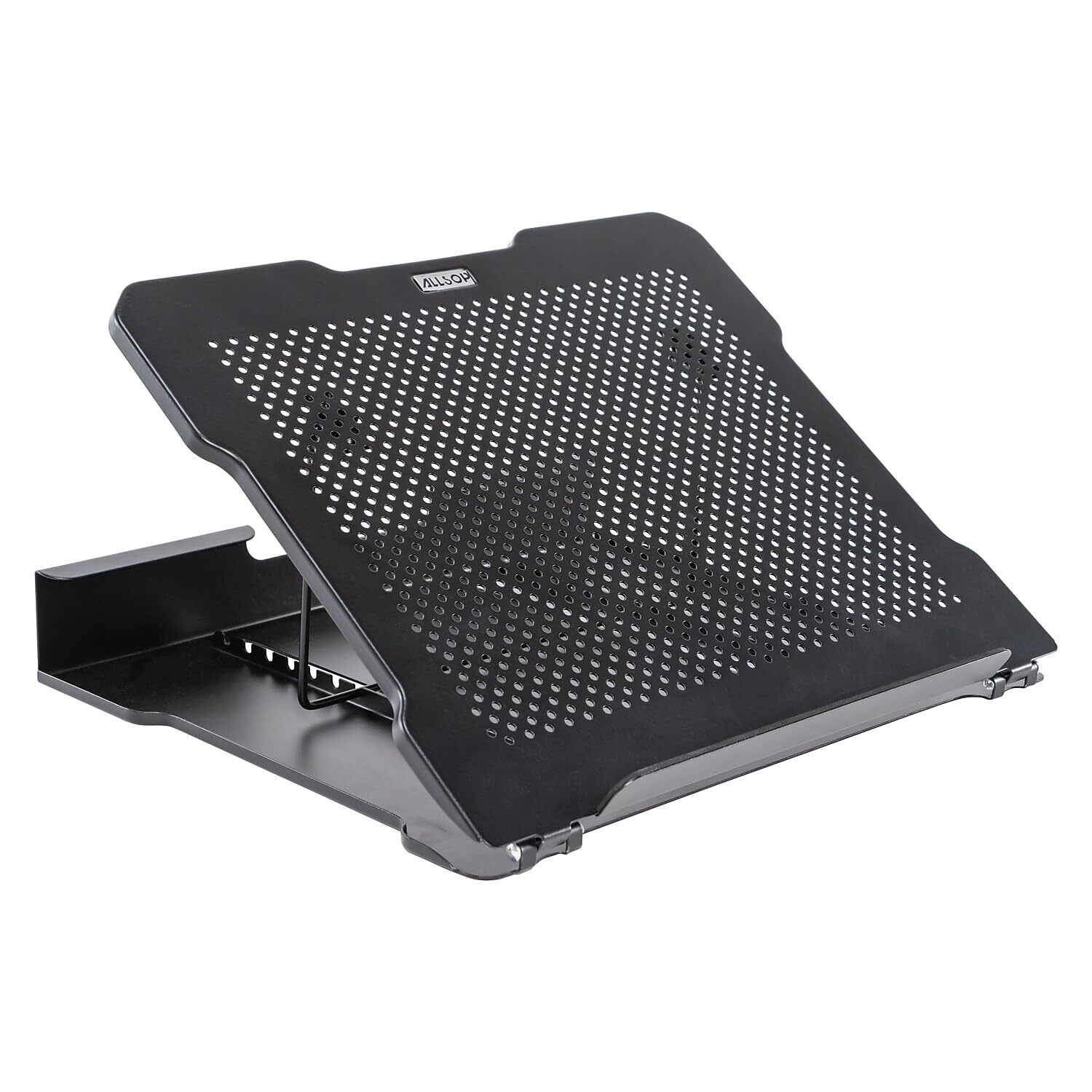 Laptop stand features an adjustable design with six angle options to provide a comfortable way to view your laptop or tablet. Large construction provides ample space for your device to keep it securely positioned. Ventilated structure allows air to flow freely to prevent your device from overheating. Plus, this laptop stand folds to a more compact size for convenient storage. Holes improve airflow 7 angles for comfortable viewing Black