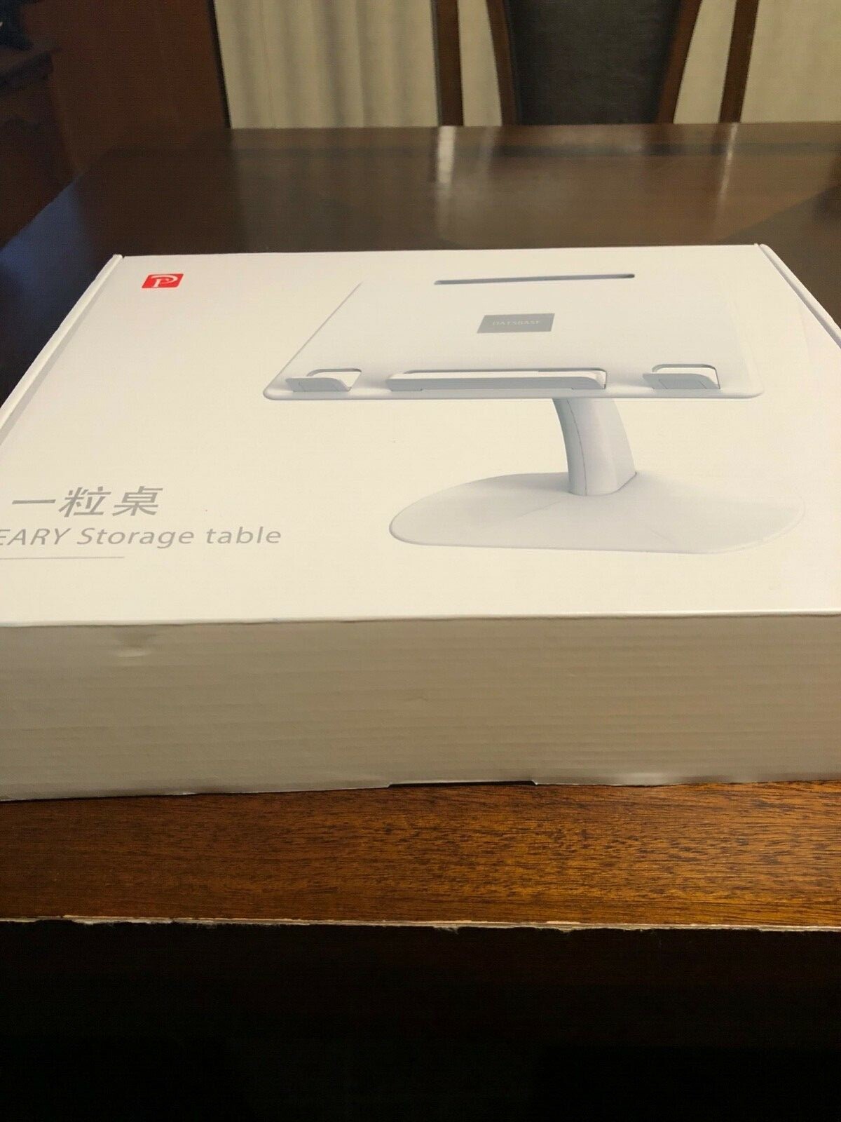 Laptop stand adjustable. Barely used comfortable with your Laptop or IPad. Still in box for proper storage.