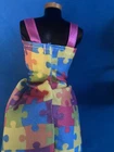 This product is an adorable multicolored dress set for Barbie dolls. It includes a puzzle-piece sundress, bag, hat, and sunglasses. Made of cloth material, this set is perfect for dressing up your Barbie doll in style.