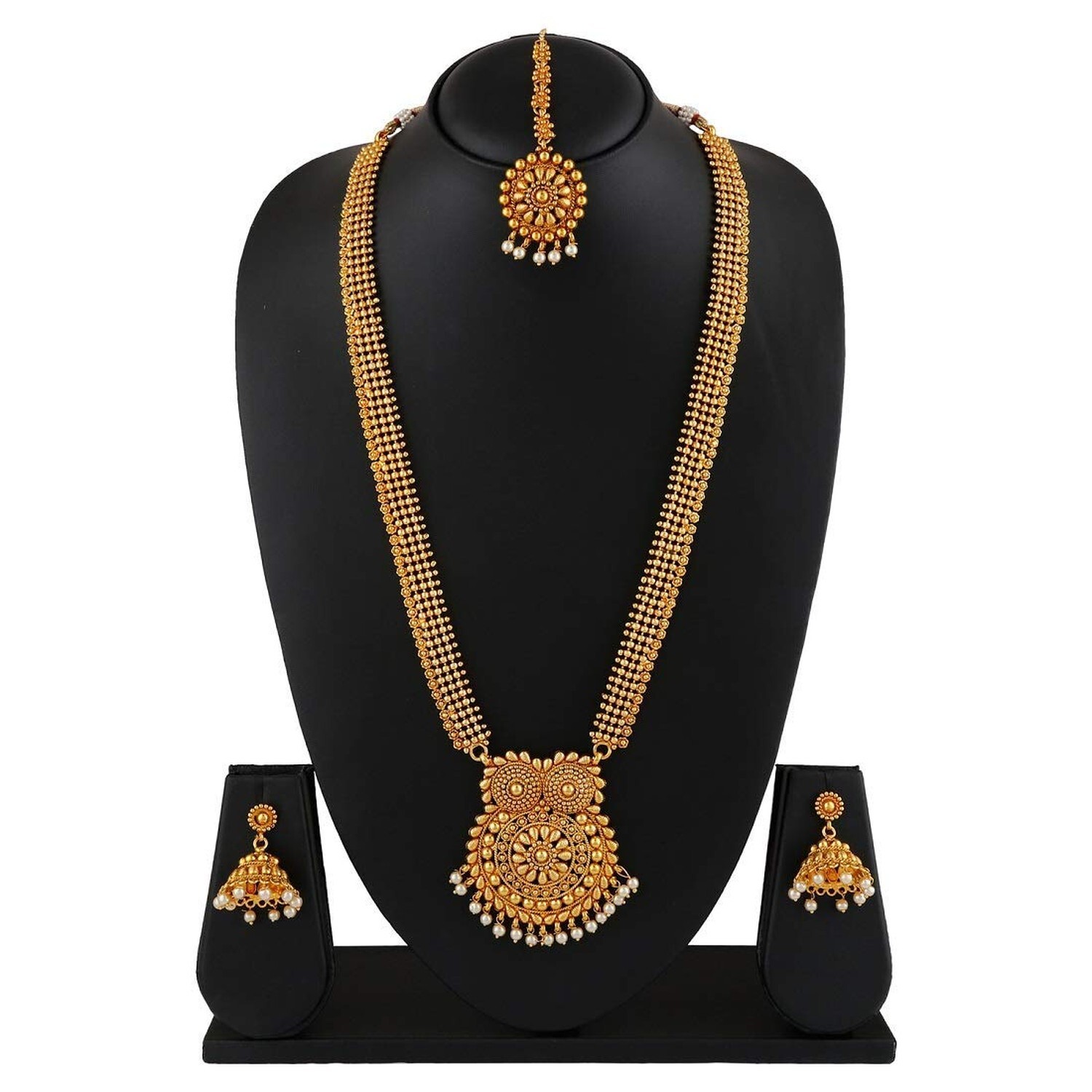 Aheli Golden Indian Traditional Bollywood Wedding Bridal Jewelry Set for Women Girls Product Details Product Dimensions : 8.27 x 1.26 x 6.06 inches; 5.34 ounces Item model number : AH-PF04BR329 Department : womens Date First Available : November 16, 2020 Manufacturer : Aheli Brand, Seller, or Collection Name: Aheli Metal stamp: Not stamped Metal: No Metal Type Material: Copper Gem Type: No Gemstone Item Length: 8.27 inches Clasp: Lobster Clasp Ring size: adjustable Number of stones: 4 Model number: AH-PF04BR329