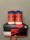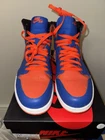 Elevate your sneaker game with these Air Jordan 1 Retro High OG "KNICKS" sneakers. These limited edition sneakers come in a vibrant orange colorway and feature a solid pattern. The high-top shoe shaft style and tie closure make these sneakers perfect for any occasion, whether it's activewear, casual wear, or workwear. These sneakers have a standard shoe width and are available in US size 11.5 and UK size 10.5. The synthetic upper material and foam insole material provide comfort and durability, making them suitable for gym and training, walking, cross-training, CrossFit, and basketball activities. These Air Jordan 1 High sneakers are a must-have for any sneakerhead who loves the 90s Knicks theme. Great condition
