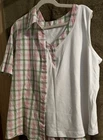 Season: Fall, Spring, Summer Theme: n/a Number of Pieces: 2 Piece Leg Style: n/a Performance/Activity: n/a Seller Notes: “Gently worn, with no defects or tears.” Size Type: Plus Features: 2 shirts - worn together or separate Closure: overshirt has button front Color: White with pink/ sage checkered print Fabric Type: Cotton and Polyester Character Family: n/a Set Includes: tank top and overshirt Pattern: Check Type: Outfit/Set Garment Care: Machine Washable Sleeve Length: Short Sleeve Inseam: n/a Vintage: No Handmade: No Brand: Alfred Dunner Fit: Classic Personalize: No Department: Women Character: n/a Accents: V-neck tank top inside a collared shirt Size: 20W Country/Region of Manufacture: Indonesia Occasion: Casual Material: Cotton, Polyester Neckline: V-Neck