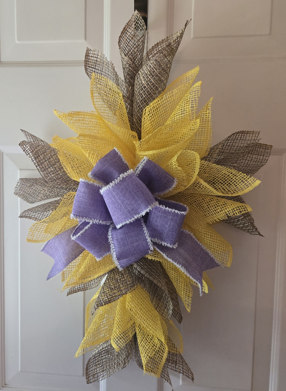 This wreath is absolutely stunning! The taupe, yellow, and lavender colors blend beautifully, making it perfect for any season or occasion. The craftsmanship is top-notch—love that the mesh was carefully cut to prevent fraying. At 25 inches tall, it’s the perfect size to make a statement without being overwhelming. The handmade details and religious theme give it such heartfelt charm. Highly recommend for adding warmth and elegance to any home!