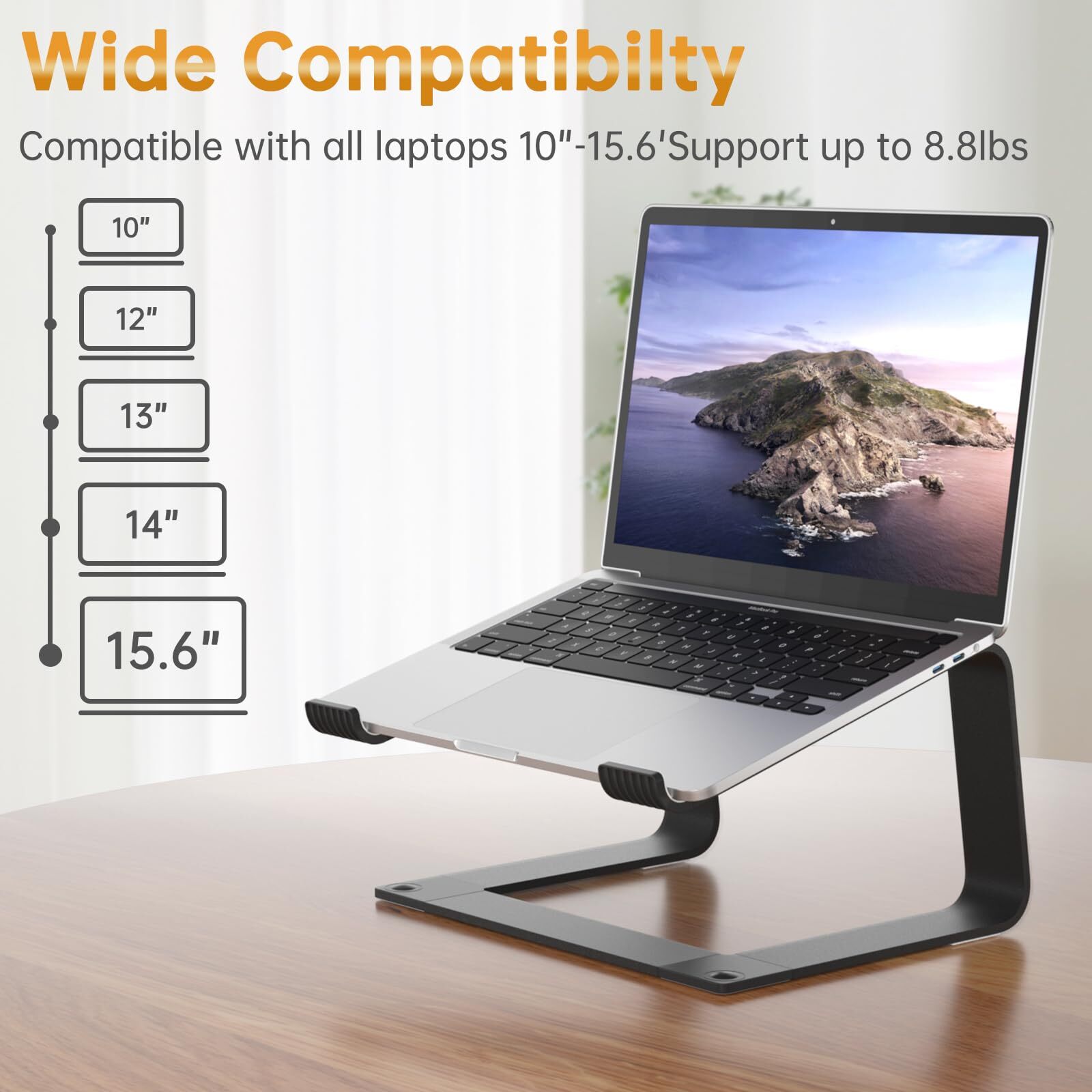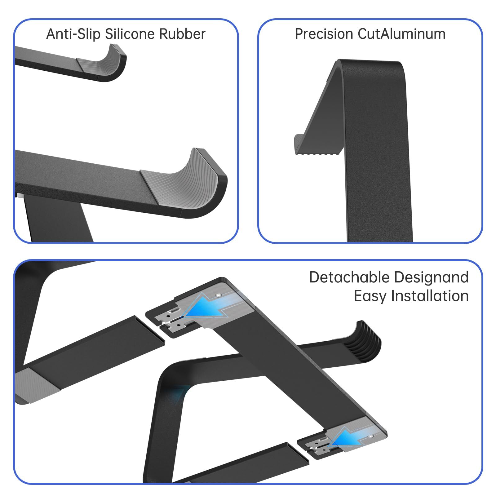 Laptop stand 【WIDE COMPATIBILITY】 This laptop stand is well compatible with all laptops from 10 to 16-inch, such as MacBook 12 inch/ 13 inch, MacBook Air 13 inch, MacBook Pro 13 inch / 16 inch (2020/ 2019/ 2018/ 2017/ 2016), Microsoft Surface, ThinkPad, Dell, HP, Chromebook, and other notebooks. 【STURDY & RELIABLE】The laptop stand is made of aluminum alloy, sturdy enough to hold up to 11lbs (5kg) of weight. The soft rubber pads are designed to protect your laptop from scratches or slipping 【DETACHABLE & PORTABLAE】 The laptop holder is compact, lightweighted, and easy to install or disassemble. You can take it apart and carry it with you on the way to the library. 【HEAT DISSIPATION】 This laptop riser allows free airflow underneath, which helps to dissipate the heat of your laptop. Moreover, the aluminum alloy body helps to absorb and diffuse heat. 【ERGONOMIC DESIGN】 This laptop stand can help to relieve neck and shoulder pain by elevating your laptop to eye level.