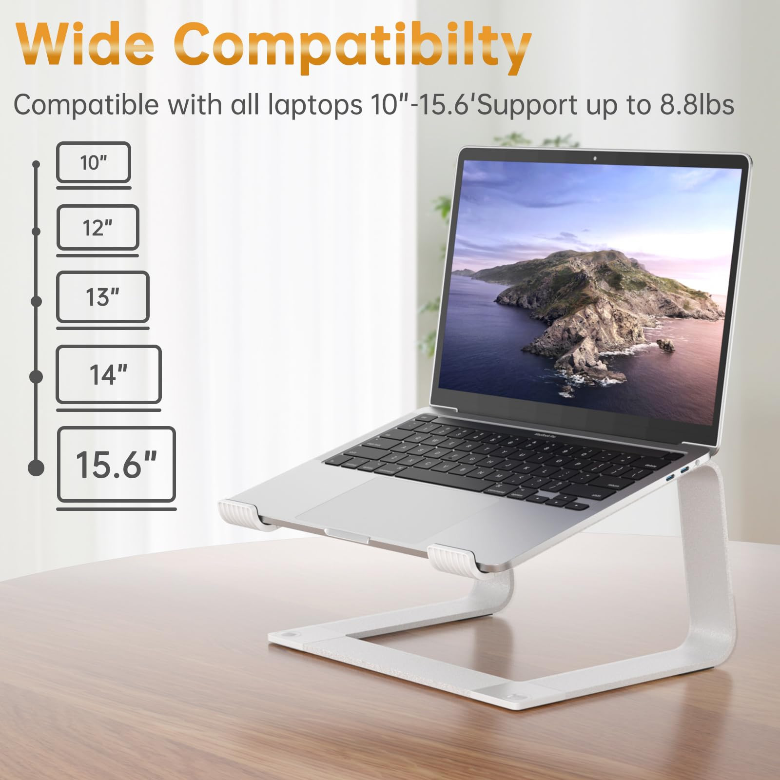 Laptop stand 【WIDE COMPATIBILITY】 This laptop stand is well compatible with all laptops from 10 to 16-inch, such as MacBook 12 inch/ 13 inch, MacBook Air 13 inch, MacBook Pro 13 inch / 16 inch (2020/ 2019/ 2018/ 2017/ 2016), Microsoft Surface, ThinkPad, Dell, HP, Chromebook, and other notebooks. 【STURDY & RELIABLE】The laptop stand is made of aluminum alloy, sturdy enough to hold up to 11lbs (5kg) of weight. The soft rubber pads are designed to protect your laptop from scratches or slipping 【DETACHABLE & PORTABLAE】 The laptop holder is compact, lightweighted, and easy to install or disassemble. You can take it apart and carry it with you on the way to the library. 【HEAT DISSIPATION】 This laptop riser allows free airflow underneath, which helps to dissipate the heat of your laptop. Moreover, the aluminum alloy body helps to absorb and diffuse heat. 【ERGONOMIC DESIGN】 This laptop stand can help to relieve neck and shoulder pain by elevating your laptop to eye level.