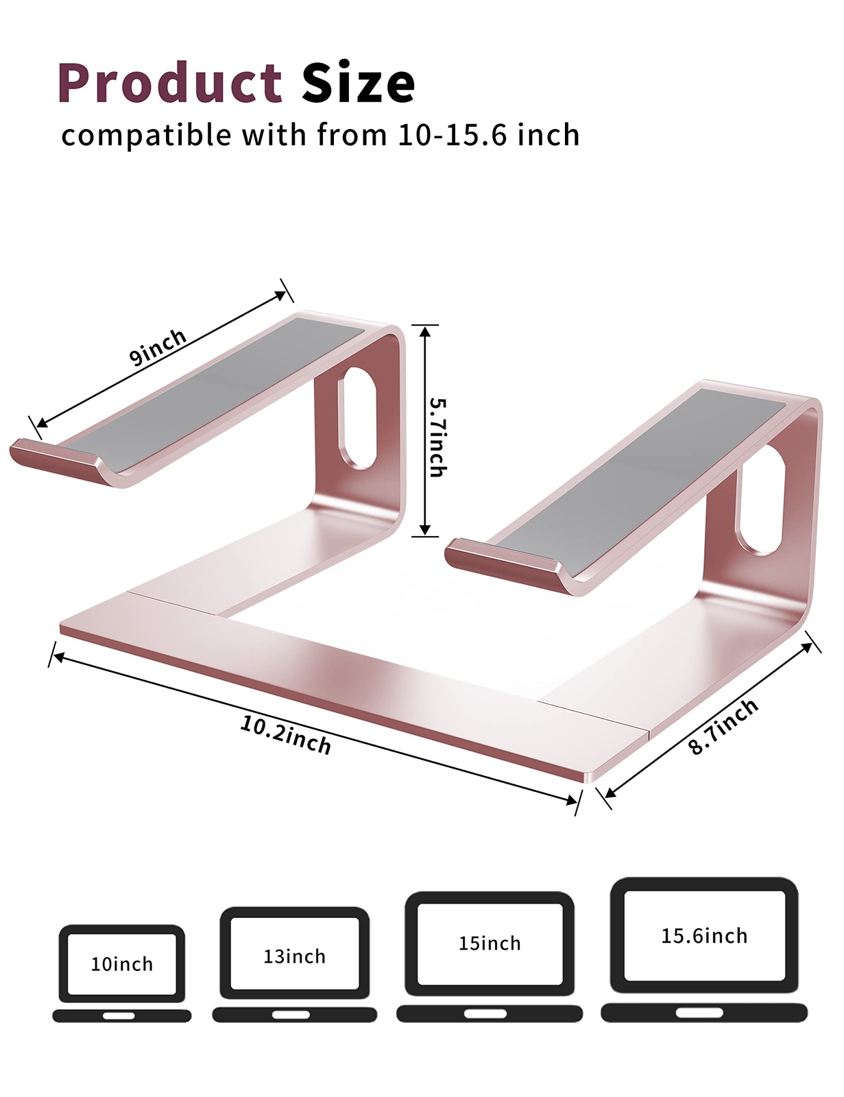 We offer Free Shipping on all order!! Welcome to my stores, The Smart of your choice and satisfaction guarantee. Laptop Stand for Desk, Aluminum Computer Riser, Ergonomic Notebook Holder, Detachable Metal Laptops Elevator, PC Cooling Mount Support 10 to 15.6 Inches Notebook, Pink Product Description Broad Compatibility - Suitable with laptops of 10 to 15.6 inches, such as MacBook Pro 13/15, MacBook Air 13.3, Dell, XPS, Lenovo, HP, ASUS, Google Pixelbook, Samsung and other notebook computers of 10, 11, 12, 14, 15.4, 15.6 inches, etc. Ergonomic Design - Elevates your laptop height by 6 inches, a perfect height for your eye, neck and shoulder. Durable & Protective - Metal appearance made of thickened aluminum alloy, strongly durable. The rubbers on the top and bottom of holder ensure it sticks tightly to your laptop and desk, and protect your computer and desktop from scratches. Easy Installation & Portable - This laptop stand can be easily disassembled into 3 parts, can be install in 2 steps. Heat Dissipation & Space Organized - The open design keeps your laptop from overheating, and allows more space for storing. You can organize your keyboard, mouse, or other office supplies under the thin stand. Payment Policy - Payment managed by eBay. Shipping Policy - We do not ship to a different address. we will ship to the address you provide on the ebay only. Please check your address before purchase. - Items are dispatched within 24 hours (except weekends and holidays) and shipped from US. - It should take 3-5 business days for the product to reach your destination (Saturday and Sunday excluded). - We use a selection of shipping services such as UPS, FedEx, USPS etc. - We ship only to the 48 contiguous states of America. We do not ship to Hawaii, Porto Rico, Alaska, US Protectorates, APO/FPO addresses and PO Boxes. Local pickups are not offered. - If it takes any longer than that, please do not hesitate to contact us to resolve the issues. Returns Policy - This product comes with 30-Days Money Back Guarantee. - If you receive an item and it doesn't work properly or you don't like it because of any reason at all, - We have a 100% refund/return policy. We will ship you a new item or refund your money for the full sale amount. - For all returned products, buyers MUST contact us for the returning address.