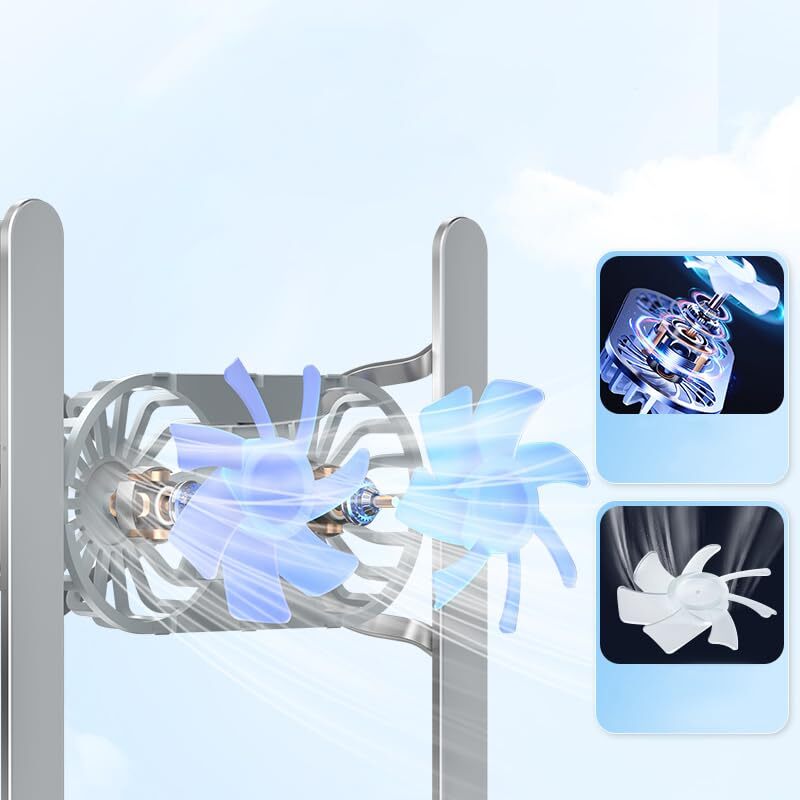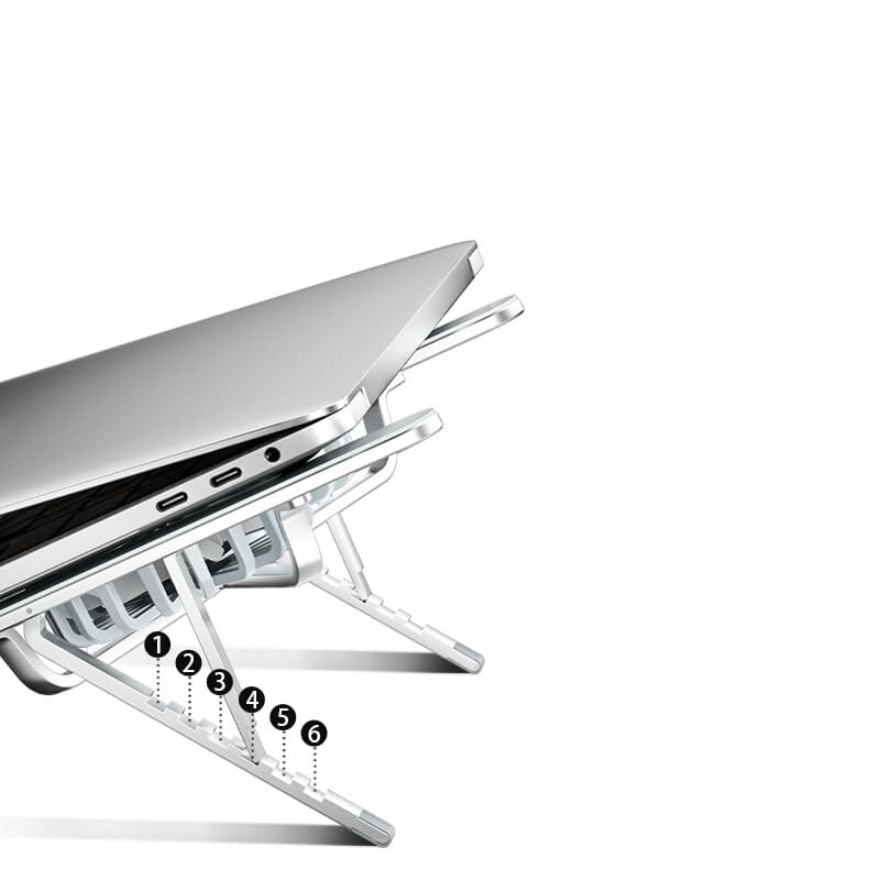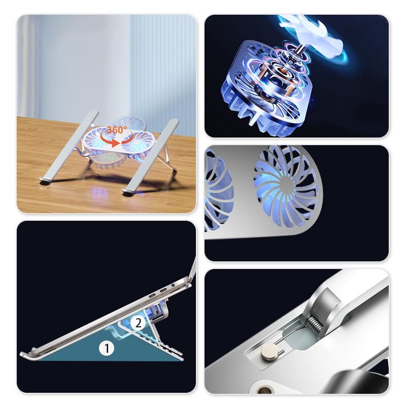 Aluminium Alloy Adjustable Multi-Angle Laptop holder Compatible with MacBook, Air, Pro&All Laptops 【Cooling Better with Dual Cooling Fan】There are two adjustable cooling fans in the middle of the laptop stand. Dual fan combination ensures strong wind and faster heat dissipation. 【All-Metal Material Laptop Stand】This computer stand is made of thickened aluminum alloy material, the all-metal material naturally absorbs heat, accelerates heat dissipation. 【Low Running Noise】This notebook stand can effectively prevent the computer from overheating,at the same time, the running noise is very low, when you work with it, you will not be bothered by the noise. 【Universal Compatibility】This laptop cooling stand fits a variety of notebooks up to 21 inches, such as MacBook, MacBook Air, Macbook Pro, Microsoft Surface, and other notebooks PC computers. 【Sturdy & Stable】The laptop stand is made of thickened aluminium alloy, which is quite sturdy supports up to 22 lbs (10 kg) on the top. Double triangular support structure, very stable and not shaking.The upgrade rubber mat on the stand ensures the laptop in place and maximumly protect your device. 【Ergonomic Design】Ergonomic design, six heights adjustment, you can adjust the screen angle and height of the laptop according to what you prefer, elevate the eye level to the screen, fix your posture, protect you from neck and shoulders pain.