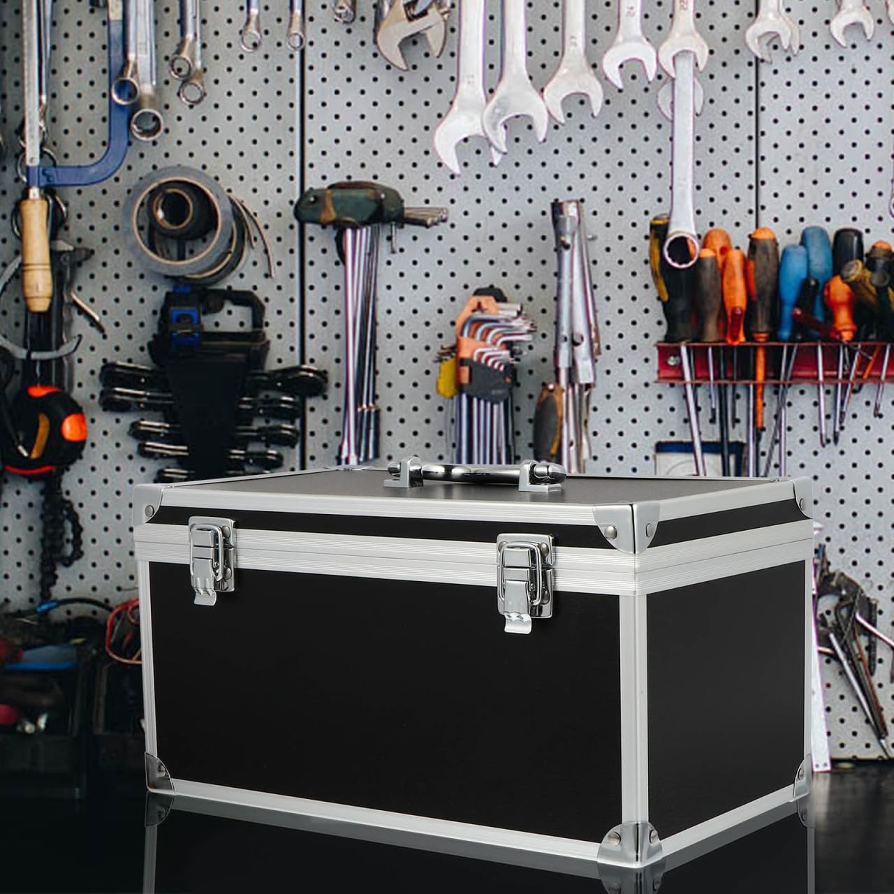 Features - : Equipped with sturdy crash- shell and shockproof foams inner material - Durable: , it is not easy to . - Practical: It is able to withstand large impacts without being damaged and effectively protects your stuff in great safety - Works Well: Ergonomic handle makes it comfortable and labor-saving to hold the tool box in hand - Multipurpose: Buckle lock protect your stuff from accidental drop or Specification: - Color: Black - Material: Aluminum alloy, ABS, flannelette and foams Package Including 1 x toolbox Solid and Durable Material:This toolbox is made of ABS , aluminum alloy and foam inserts, solid and durable, resistant to impact and not easy to crack. Designed with a size, it is a good choice for carrying your power tools, hand tools, and various hardware Proper Size and :Size information: 29cm/11.4 inch in length, 16cm/6.3inch in width, 15cm/5.9inch in height; Thismetal toolbox is equipped with an easy-to-grip solid handle on the top, combined with its lightweight structure, just grab and go Double Security Lock Design:This tool box comes with 2 lockable hinge to prevent internal tools from accidentally falling out while being carried, keeps your valuable tools safe Add Foam Insert for Better Protection:The tool case is equipped with sturdy crash- resistant black shell and shockproof inner material, able to withstand large impact without being damaged and effectively protects your stuff in great safety Multifunctional Toolbox for Widely Use:This multipurpose tool organizer box can well organize your repair tools, bringing convenience to all kinds of maintenance work, such as auto repair or appliance repair. Also, it allows you to easily store fishing tools, craft supplies, hardware and sewing supplies in an organized manner to meet your different needs