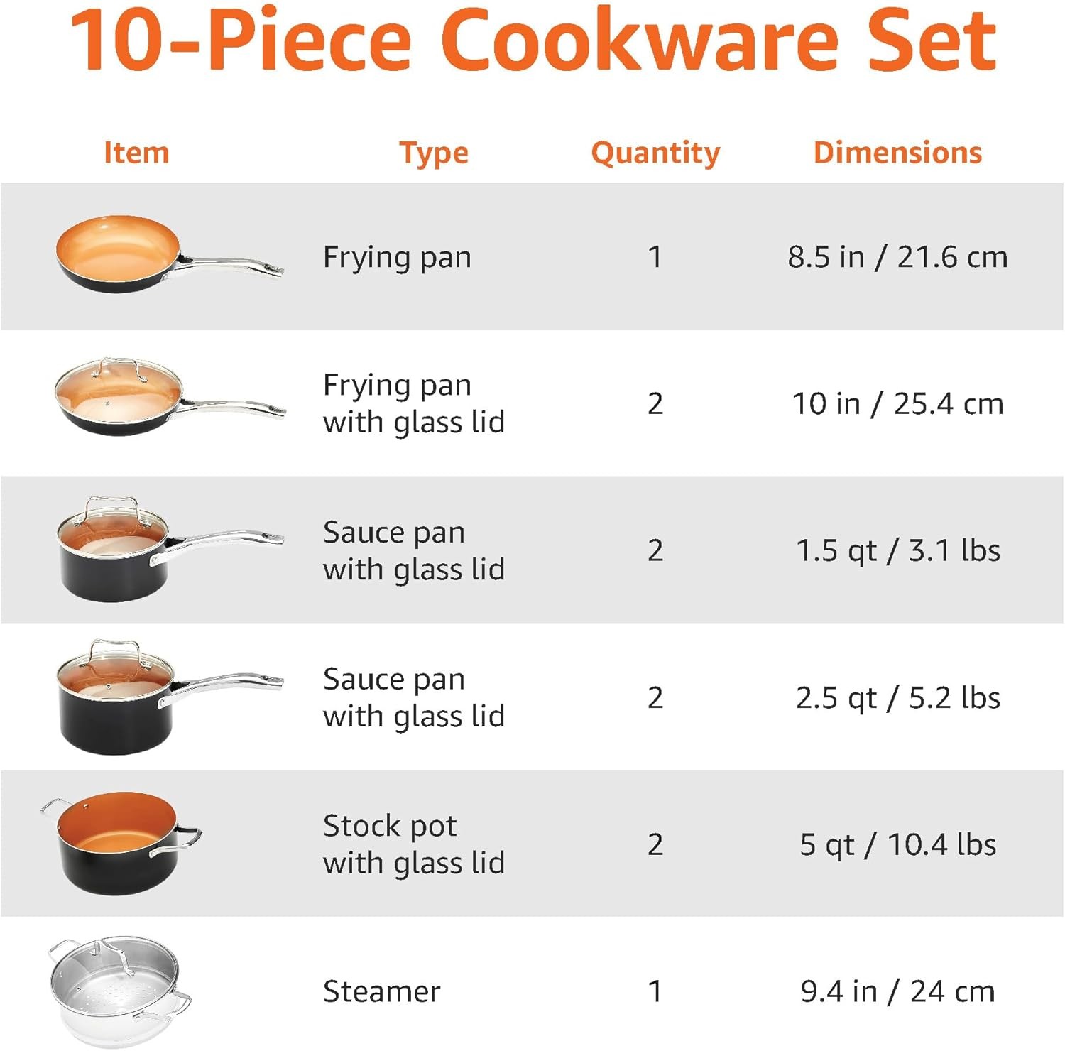 Product Details Material: Ceramic Color: Brown Size: 10-Piece Set Handle Material: Stainless Steel Is Dishwasher Safe: Yes Compatibility Options: Induction ready base compatible with all cooktops Number of Pieces: 10 Closure Material: Tempered Glass Included Components: 8.5-inch fry pan, 10-inch fry pan with glass lid, 1.5-quart sauce pan with glass lid, 2.5-quart sauce pan with glass lid, 5-quart stock pot with glass lid, and a 24cm stainless steel steamer Is Oven Safe: Yes With Lid: Yes Special Feature: Non Stick Item Weight: 14.4 Pounds Product Dimensions: 23.78 x 14.37 x 11.02 inches Item Weight: 14.4 pounds Country of Origin: China Item model number: CC101AZ 10-piece cookware set with 8.5-inch fry pan, 10-inch fry pan with glass lid, 1.5-quart sauce pan with glass lid, 2.5-quart sauce pan with glass lid, 5-quart stock pot with glass lid, and a 24cm stainless steel steamer Durable aluminium body delivers even heat distribution with no dead zones or hot spots Premium ceramic nonstick coating provides easy food release and cleaning Comfortable ergonomic stainless steel handles for solid, safe and comfortable grip Induction ready base compatible with all cooktopsOven safe up to 500 degrees Fahrenheit Copper color offers an elevated look and entertaining experience Dishwasher safe AnBrand