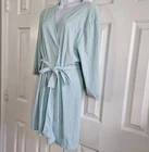 Amelia's Collection Short Robe Good pre-owned condition, no flaws 63% polyester, 34% rayon, 3% spandex, lightweight ribbed knit Color is a pastel mint green blue Ivory lace trim on sleeves Belted, belt not attached to robe Pockets at hips 3/4 Sleeves Shorter lengths, falls a few inches above knee Marked a size S/M Approximate measurements 34 inches in length from top of shoulder to bottom of hem in front