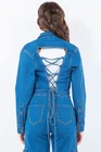 A denim laced back cropped jacket features a button front closure, cropped length, and laced back trims. This stylish piece offers a unique twist on the classic denim jacket silhouette, adding a touch of modern flair to your outfit. The button front closure provides a secure fit, while the cropped length offers a trendy and versatile look. The laced back trims add a playful and eye-catching detail, perfect for those looking to make a fashion statement. Whether paired with jeans for a casual day out or layered over a dress for a night out, this jacket is sure to elevate your style effortlessly. Add a denim laced back cropped jacket to your wardrobe for a chic and on-trend piece that you'll love to wear. Features: Lace-Up, Washed, Buttoned Stretch: Slightly stretchy Material composition: 70% cotton, 28% polyester, 2% spandex Care instructions: Machine wash cold. Tumble dry low. Imported Product measurements: S:Bust 34-36 in, Waist 26-28 in M:Bust 37-38 in, Waist 29-31 in L:Bust 39-40 in, Waist 32-33 in