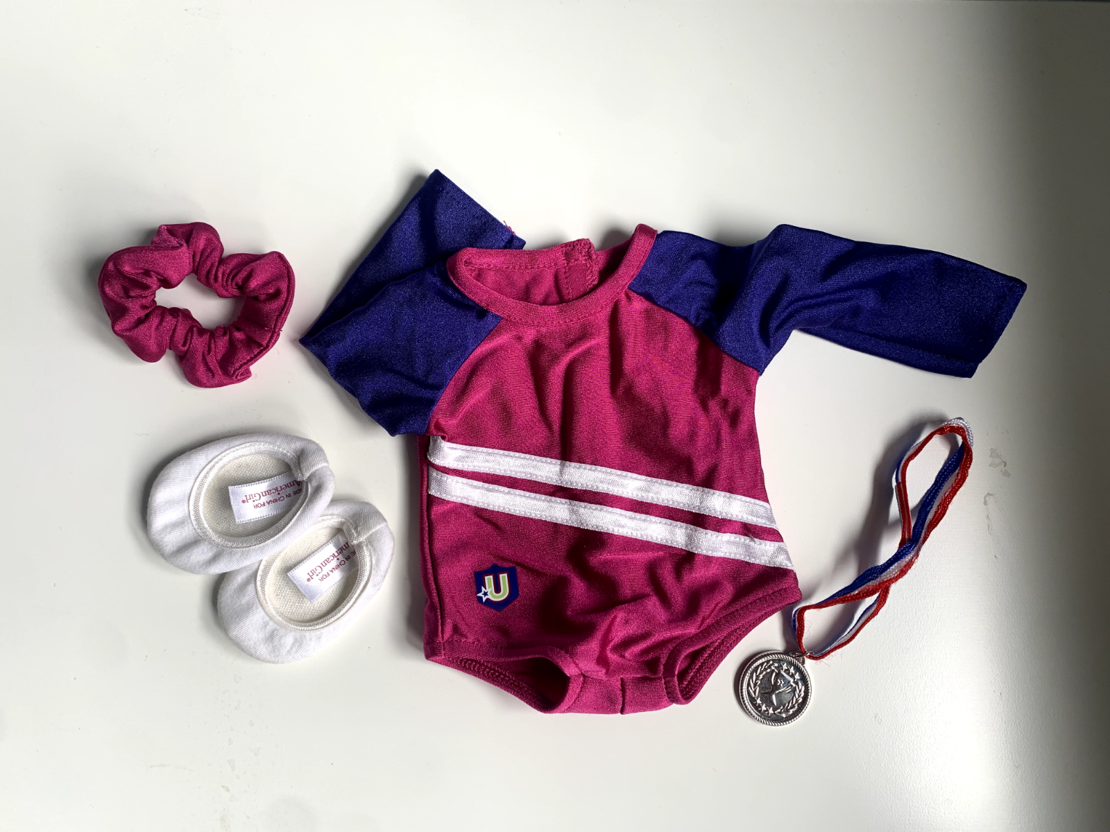American Girl Doll Gymnastics Outfit III. Manufactured 2013-2015, original price $24. Includes leotard, medal, scrunchie, 2 slippers/ballet shoes. Used but in good condition. Some slight fraying on medal -- see photo.