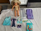 American Girl/Pleasant Company 2003 Kaylie. Retired. Many accessories but not inclusive to original. Kaylie has marks on her legs please see pictures. Accessories according to pictures for condition. Surf board, surf board carrying case. Dress, swim outfit, with swim shoes, goggles , tube and flappers. Original book. Original Owner.