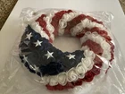 American Patriotic Floral Flag Front Door Wreath 13 inches Roses are made from heavy duty foam Stars are Metal Backing is covered styrofoam Silk ribbon for hanging Very light, easy to hang Very pretty, well made Could be used to lay on casket Could also be used to decorate grave stone but would not hold up long in rain Plastic bag was opened for pictures