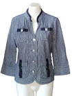 Elevate your style with this chic chambray pinstripe jacket in medium blue and white. Perfect for any occasion, this jacket features 3/4 sleeves and metal buttons for a modern touch. • Medium blue chambray • White pinstripe design • 3/4 sleeve length • Metal button details • Stylish and versatile Features: • High Collar • V Neckline • Large Metal Buttons • Adjustable straps on back at waistline • 2 chest pockets with flaps and button closure • 3/4 Sleeve, Multiple Outer Pockets • Stripes • 2 waist pockets with flaps & strap closures • 98% Cotton, 2% Spandex • Fitted Jacket, Adjustable Size: Womens Medium Flat Lay Measurements Pit to pit 20 in / 51 cm Sleeve 19 in / 48 cm Length 23.5 in / 60 cm Condition: Pre-Owned Good Good condition Gently used No rips, stains, tares, or pilling No visible signs of wear Measurements are found in the description Please review all photos and descriptions closely before purchasing. Thank you! Smoke free workspace Please read the description for further details and measurements, Thank you!