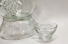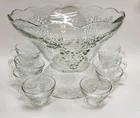 The 20 piece set includes the following: - 1 Glass Punch Bowl, alone measures 6.25" tall, 12.25" diameter scalloped rim, 5.25" diameter flat base, holds about 1 gallon of liquid - 1 Glass Pedestal Bowl, alone measures 3" tall, 8-5/8" diameter scalloped rim, 5.25" diameter flat base (When fully assembled with the punch bowl on top of the pedestal bowl, the two pieces stand 9.25" tall) - 7 Clear Plastic "S" hooks to hang the cups from the bowl for display - 11 Glass Punch Cups, measure 2.25" tall, 3-58" diameter rim, measures 4.25" from tip of rim to tip of handle, holds about 1/2 cup of liquid (or about 4 fluid ounces)
