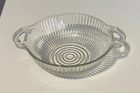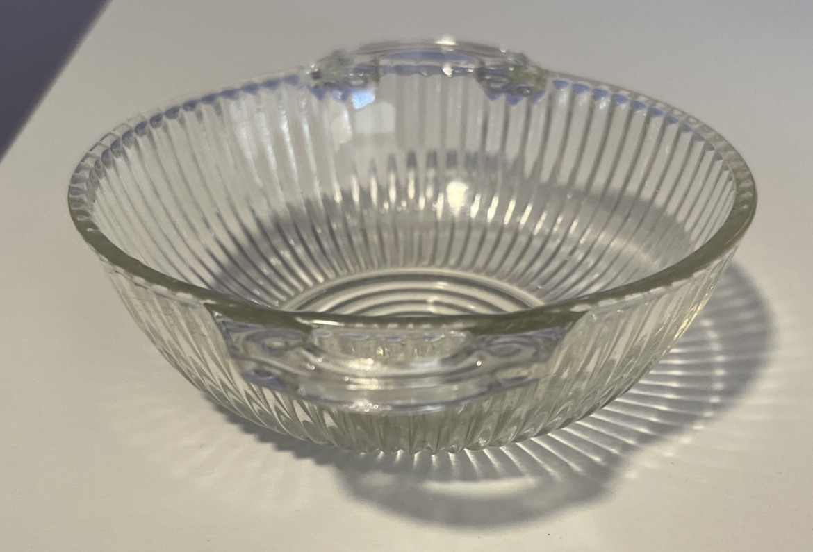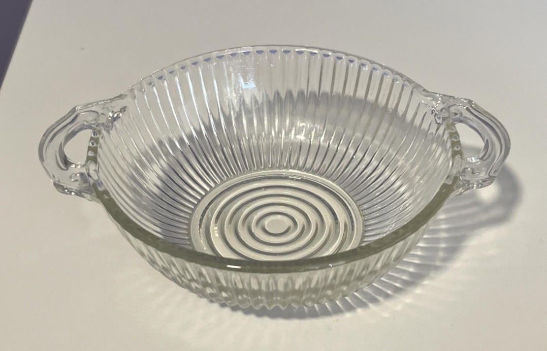 Anchor Hocking Queen Mary Clear Glass Small Fruit Dessert Bowl w/ Handles - 5 7/8" wide with handles The Queen Mary pattern has vertical ribs and handles and was produced by Anchor Hocking 1936 - 1949. This piece shows some manufacturing blemishes which is common for the time period produced. Please review all pictures carefully as they are part of the description. Questions are welcome.