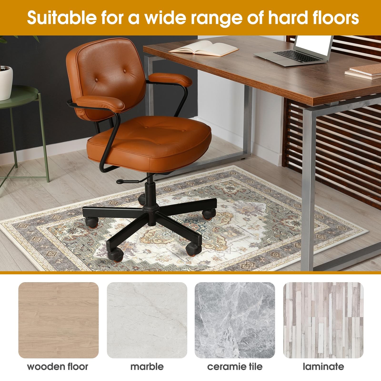 Office Chair Mat WITH NON-SLIP PAD: 's Hardwood Chair Mats have a non-slip backing specifically designed to fit office chairs. The rubberized non-slip backing keeps the chair mat firmly attached to the floor and prevents the chair mat from moving when the chair slides. This makes it safer and more reliable to use. ANTI-SCRATCH: In order to effectively protect the floor in the chair area, it is recommended that you use a chair mat to slow down the damage to the floor caused by the pulleys on the chair. PATTERN DESIGN: Our pattern is designed to fit the chair mat original design. If you are tired of transparent or solid color office chair mats you can try using office chair mats with patterns. This pattern is vintage and colorful, suitable for all styles of office style, can add interesting elements to the monotonous office. FIT FOR FLOORS: Our chair mats for carpet are ergonomically designed to fit a variety of floors and fit well on the floor, effectively minimizing curling and shifting. It is perfect for hardwood floors, tile, laminate and linoleum. EASY TO CLEAN: The surface of the chair mat for carpet is densely woven with good abrasion and stain resistance. You can use a vacuum cleaner or sweeper robot to clean it on a daily basis. PET FRIENDLY: Unlike other Hardwood Chair Mats, our this Hardwood Chair Mat has a good warm touch and is pet friendly.