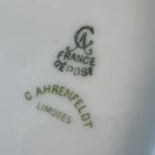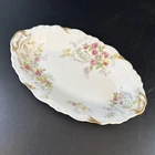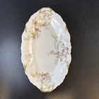 This antique 8.5" oval relish/celery dish by Charles Ahrenfeldt Limoges originates from Limoges, France, and was manufactured in 1894. The dish features a Victorian style with a glossy finish, adorned with a pattern of pink roses on a white background with blue, green, and gold trim. Measuring 6 & 3/8 inches in length, 4 & 1/8 inches in width, and 5/8 inches in height, this porcelain dish is an elegant piece for any occasion and would make a lovely display item for collectors of art pottery from the early 20th century.