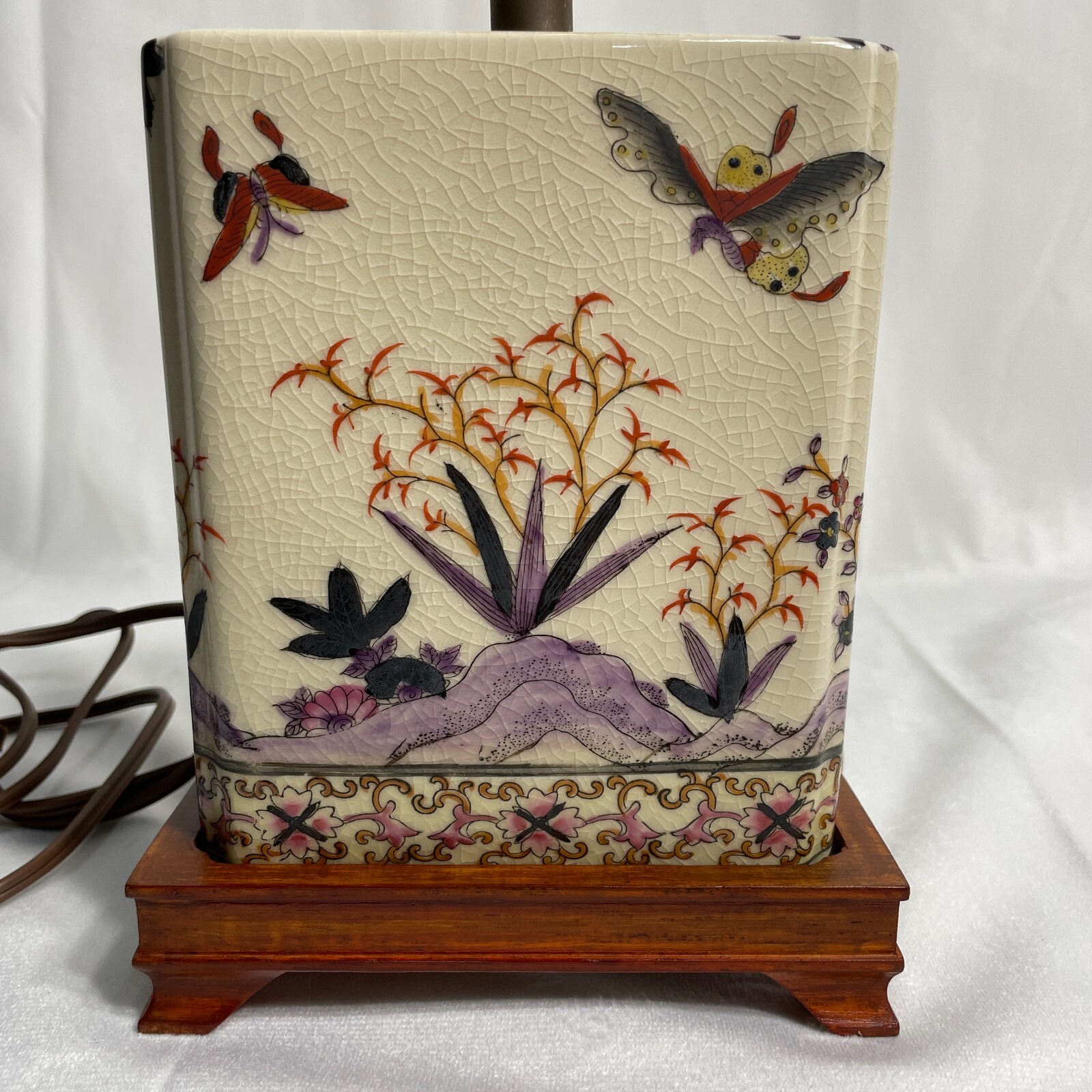 This Antique Porcelain Lamp from the 1940s features a beautiful Multi Color Floral Design on a Wood Base. The lamp has a Shaded design with a Bell-shaped Lamp Shade included. It is a vintage piece with a 1940's style and an Original design. The lamp has a Corded Electric Power Source with Knob Control and a 3-light Switch option for easy operation. Standing at 17 inches high, this Lady Lamp exudes a classic Art and Floral theme, making it a unique addition to any Unisex Adults' living space. Lamp Dimension: H 17" W 5 3/4" L 4" Cord Length: 8 ft Lamp Shad: H 8" Top Diam 8" Bottom Diam 12"