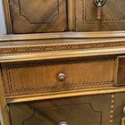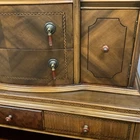 Antique Burled Wood Dresser Bakelite Handles 10 Drawer Tiered Inlaid Trim Solid Description 56" tall to top trim on backsplash, 53" tall actual height of center top section, 40" wide and 22" deep. Amazing antique depression era or older dresser. Tiered design with step back top featuring side door storage on left and right with 3 center drawers. The lower portion has 3 small center drawers and 2 lower drawers. Inlaid wood design and burled wood. The most amazing original bakelite drop drawer pulls as well. Good clean condition overall. Only issues include minor decorative raised trim missing small sections bottom left hand front side, small sliver of wood missing from right back leg (see photos), drawer interior bases show some wear as well but sturdy and stable. Amazing authentic, heavy, solid wood dresser. Condition: Used Condition Notes: Good clean condition overall. Only issues include minor decorative raised trim missing small sections bottom left hand front side, small sliver of wood missing from right back leg (see photos), drawer interior bases show some wear as well but sturdy and stable. Amazing authentic, heavy, solid wood dresser. Payment Payment Options: Paypal Shipping Shipping Options: Domestic shipping: Fixed Shipping Charges. Shipping Carrier Domestic Economy $300.00 I will ship to: United States Vendio provides powerful selling automation for sellers of all sizes. Get business information that counts! - Vendio Counters are active content free.